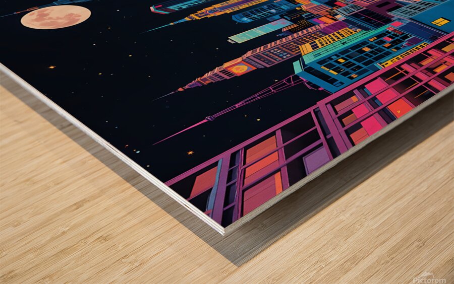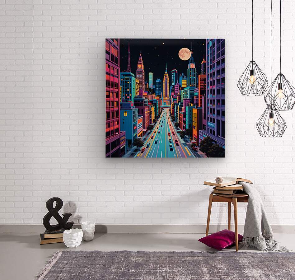 Dynamic Nighttime City View - Neon Urban Art  Wood print
