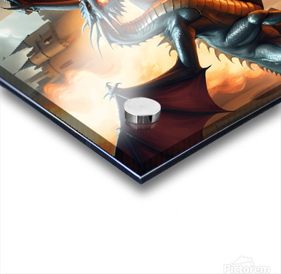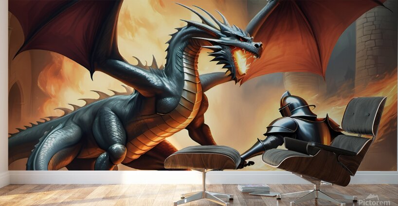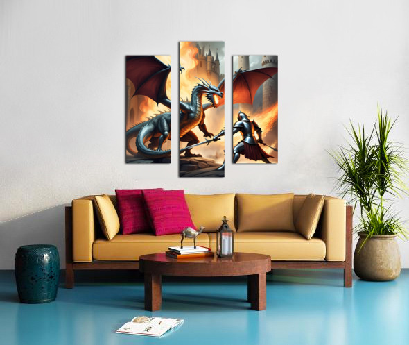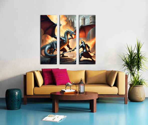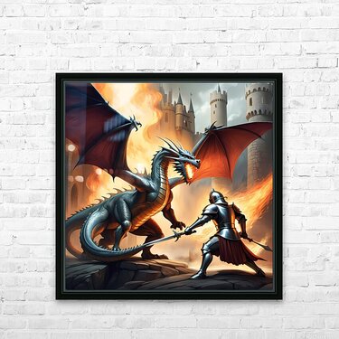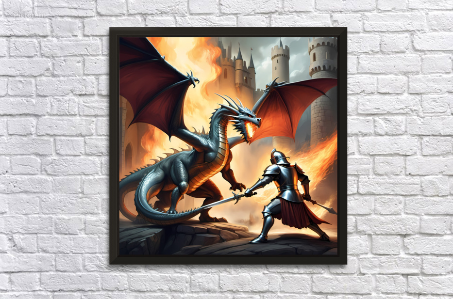 Immerse yourself in this epic dragon battle artwork, featuring a fierce dragon and a brave knight facing off against a backdrop of majestic castles. The dramatic colors and dynamic composition evoke a sense of adventure, making it a perfect addition for fantasy enthusiasts