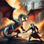 Immerse yourself in this epic dragon battle artwork, featuring a fierce dragon and a brave knight facing off against a backdrop of majestic castles. T...[+]