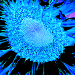 Originally a close up photo of a Sunflower, laterally digitally manipulated into a stunning piece of contemporary floral art. Features a vibrant close-up Sunflower showcased in striking blue hues with intricate petal details radiating from a textured center. The dramatic color contrast highlights the complex patterns within the floral structure.