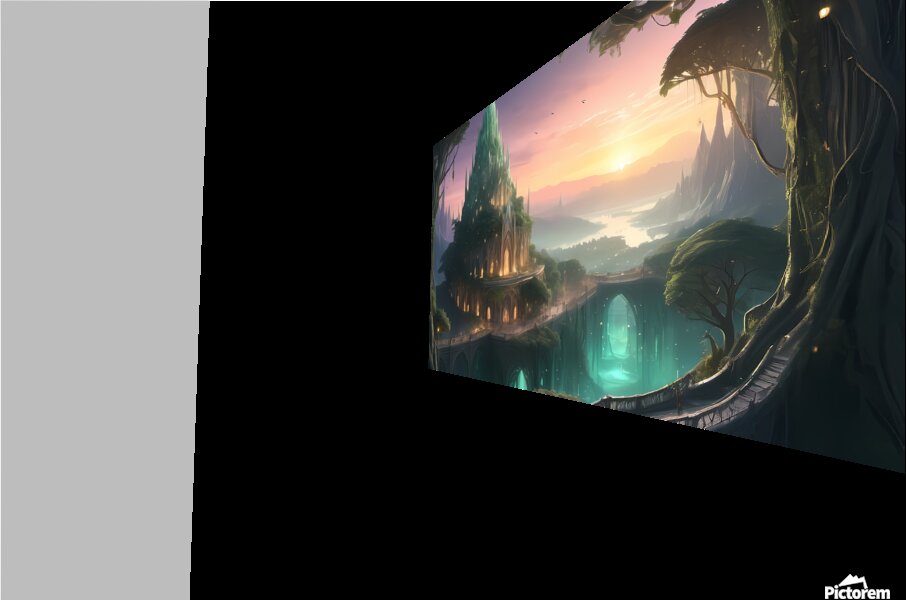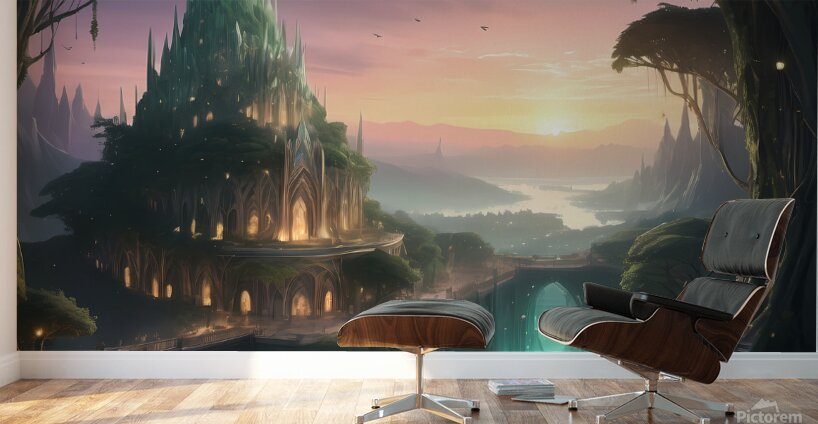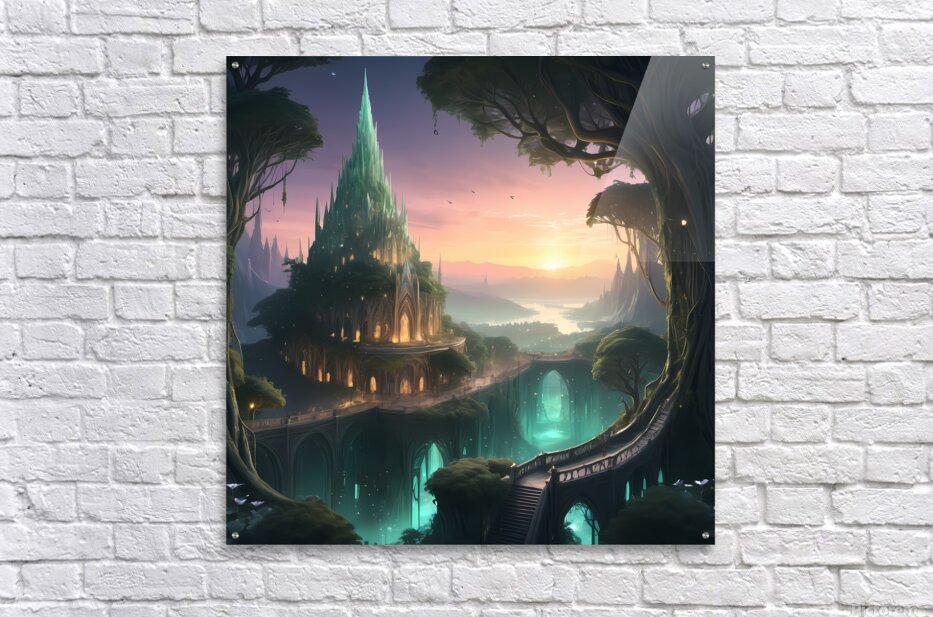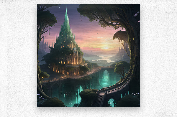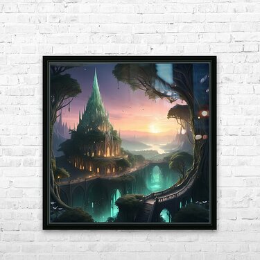 Immerse yourself in this stunning fantasy artwork featuring a majestic castle nestled among lush trees and shimmering waters. The enchanting colors an...[+]