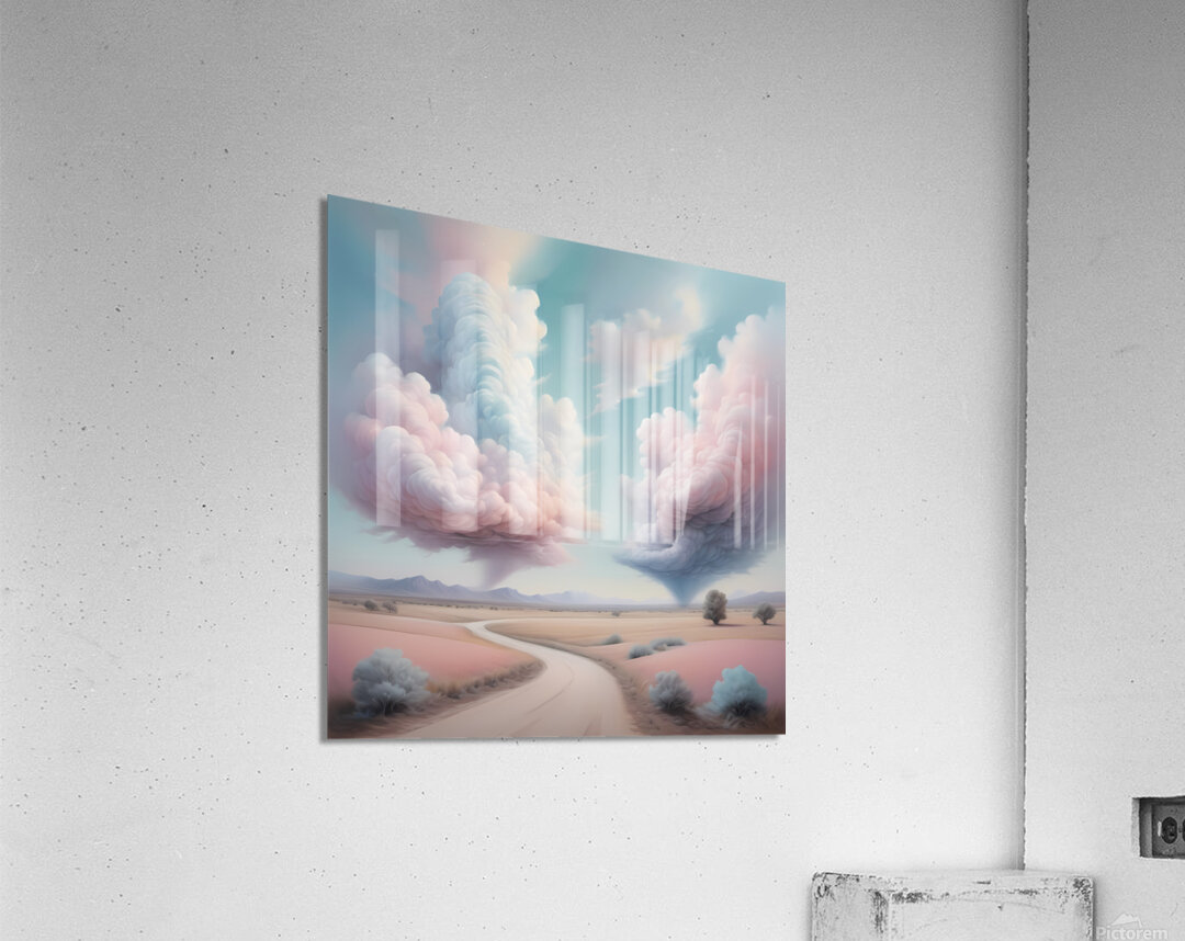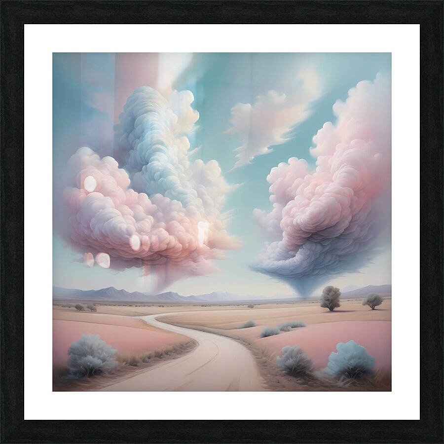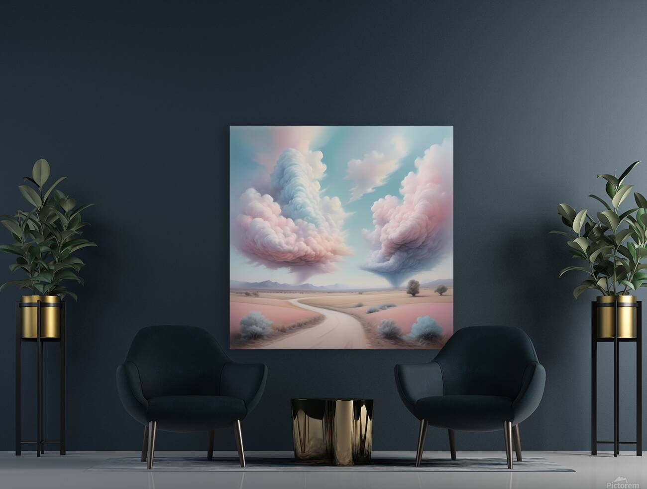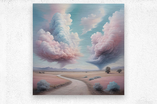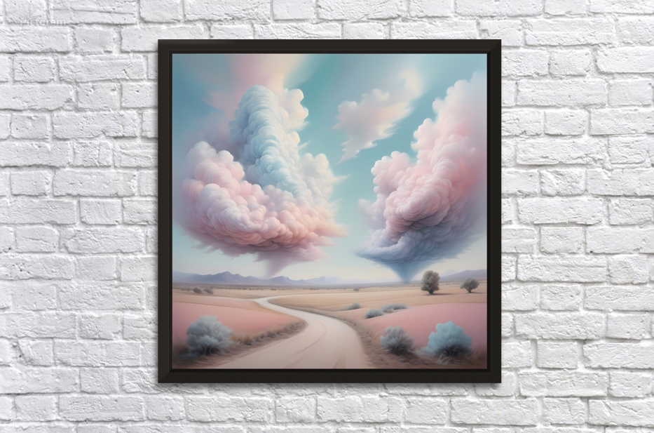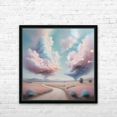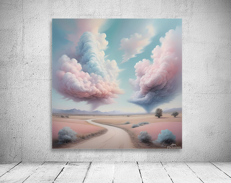 Transport yourself to a tranquil landscape with this stunning artwork featuring soft, pastel clouds drifting over a winding road. The calming colors and gentle scenery evoke a sense of peace and serenity, perfect for enhancing any living space.