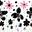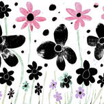 Originally a hand drawn abstract design created from imagination using coloured ink pens and paper. Laterally digitally manipulated into a stunning piece of contemporary floral art. Features bold, black flowers and soft pink blooms scattered across a bright background, accented with smaller purple and blue flowers. The simple, stylized design gives a playful and whimsical impression.