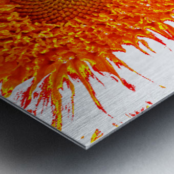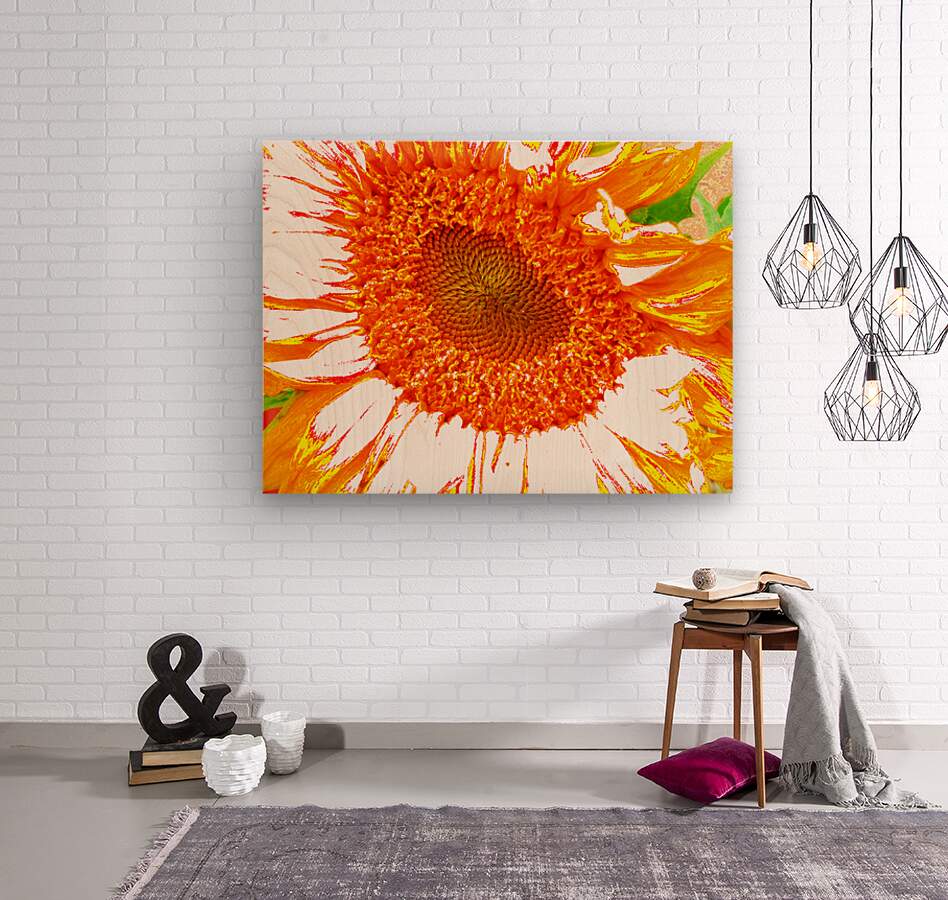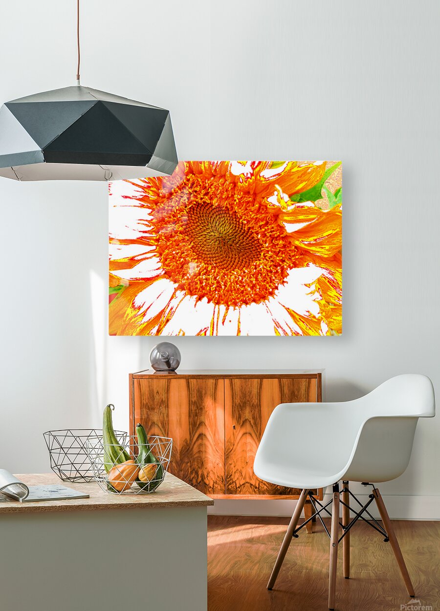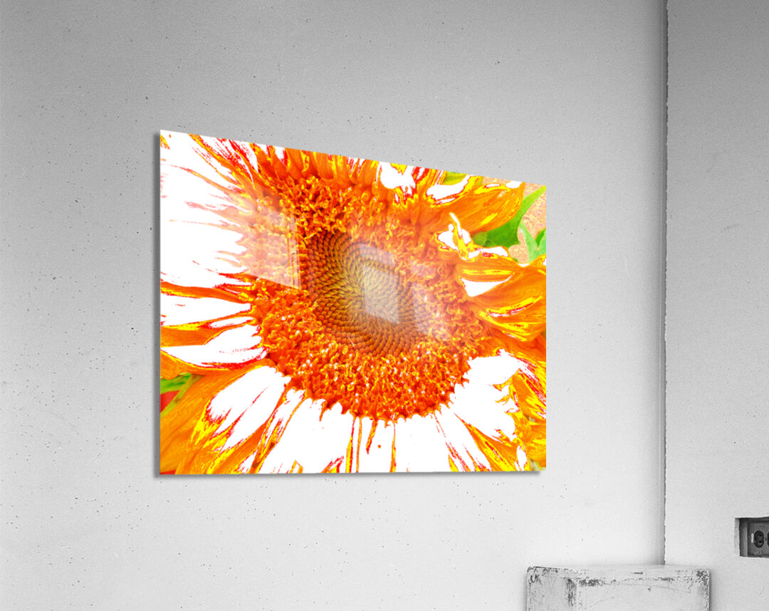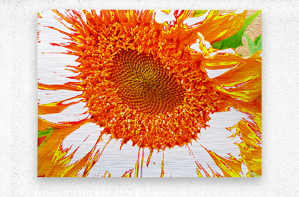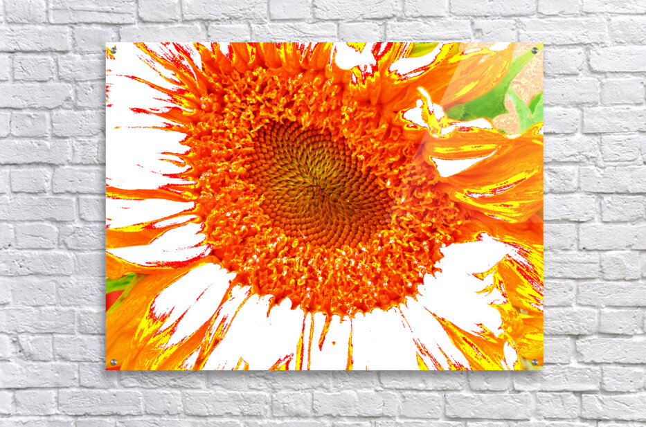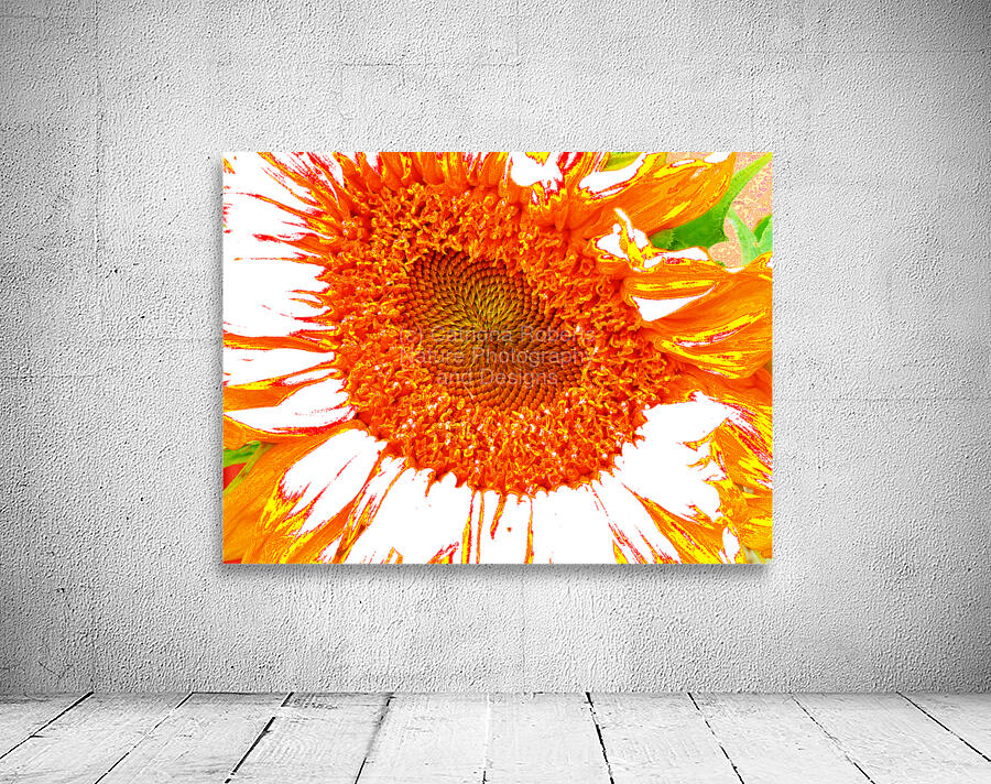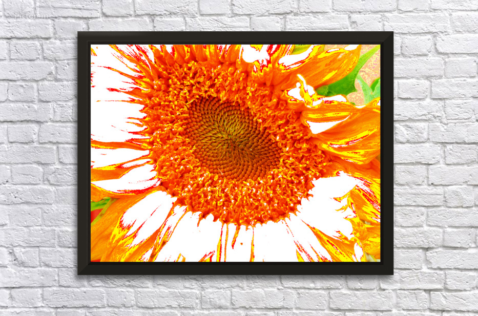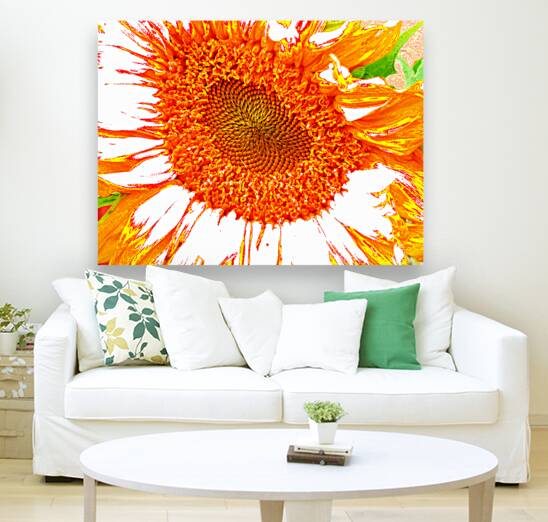 Originally a close up photo of a Sunflower laterally digitally manipulated into a stunning piece of contemporary floral art. Feature a vibrant close-up of a sunflower revealing its intricate patterns and textures, with bright orange and white petals radiating outward from the center. The detailed design of the flower's core showcases natural symmetry and complexity.