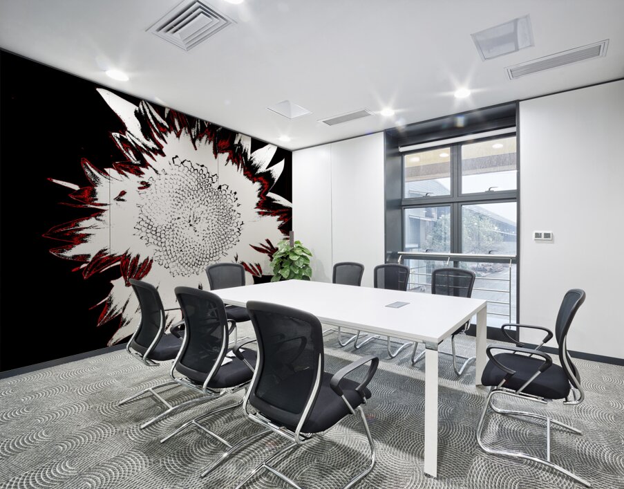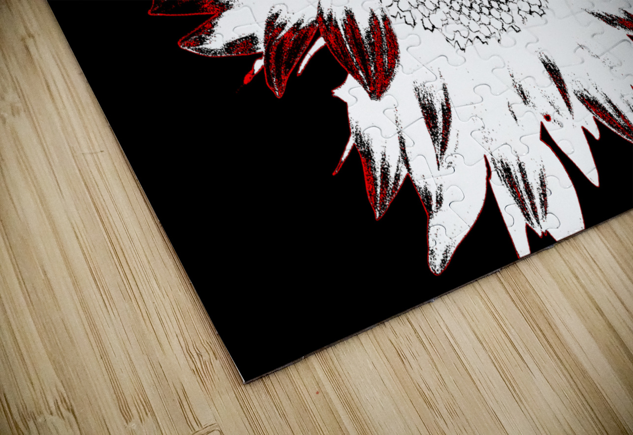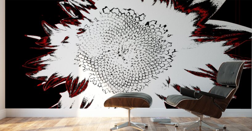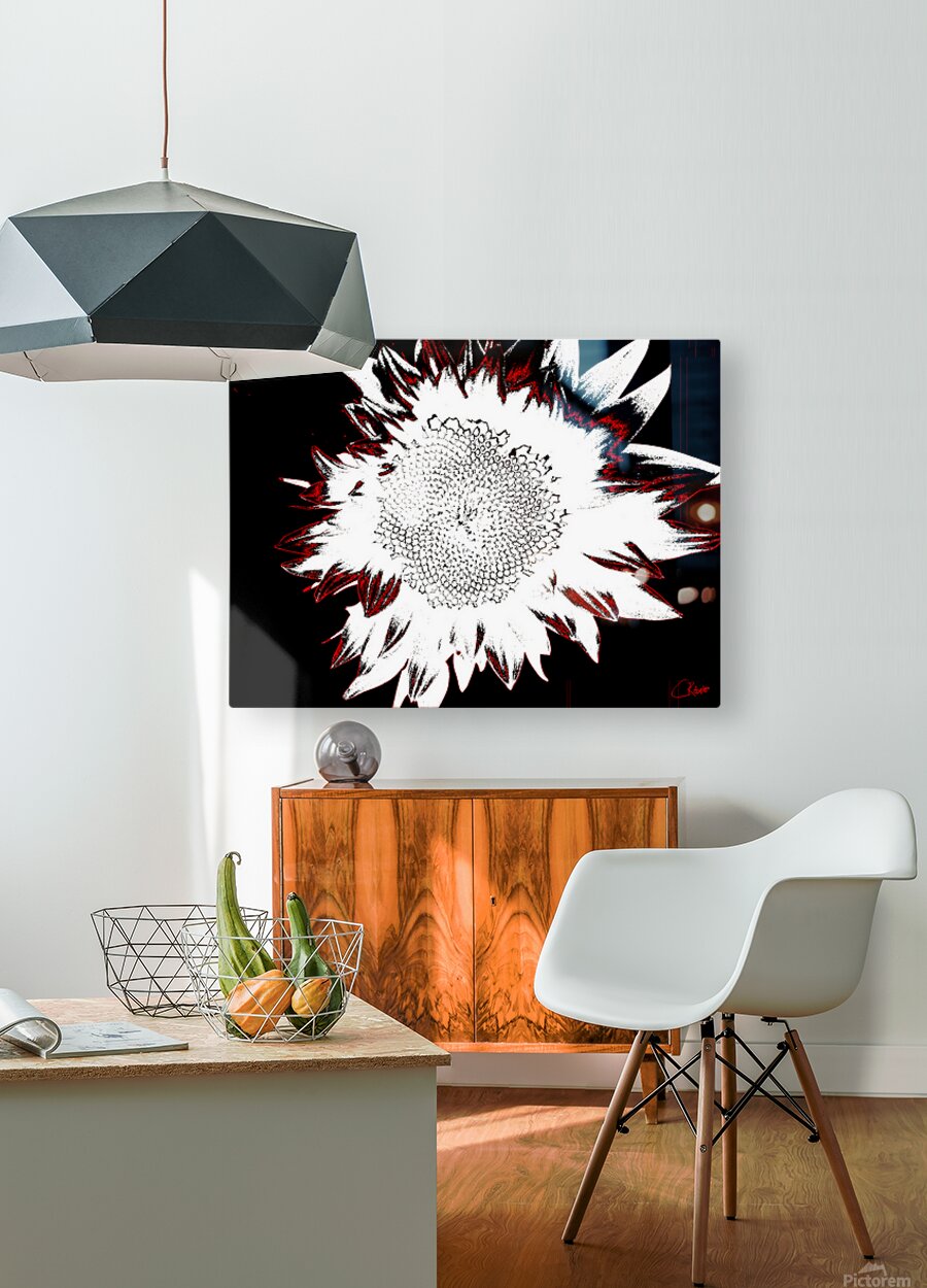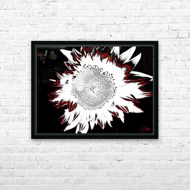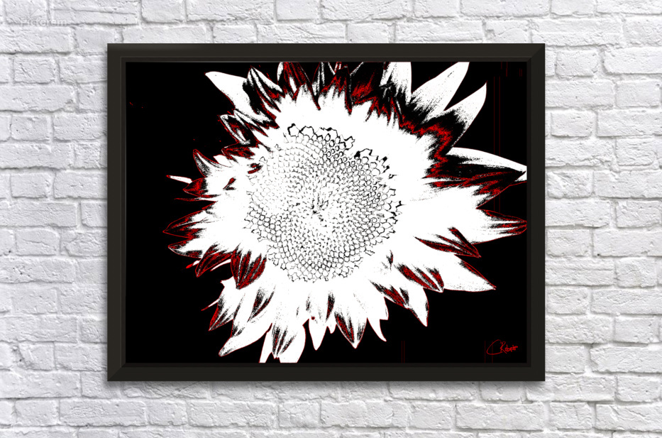 Originally a close up photo of a Sunflower and a separate hand painted acrylic, laterally digitally manipulated and combined to create a stunning piece of contemporary floral art. Features a bold depiction of a sunflower rendered in high contrast with stark white petals against a deep black background. Red accents outline the edges, adding a dramatic flair to the composition.