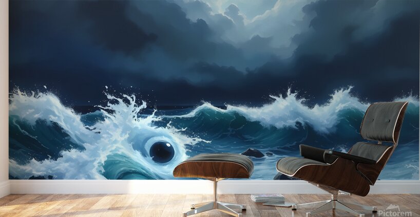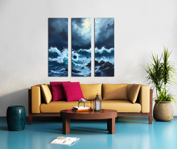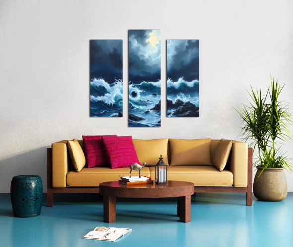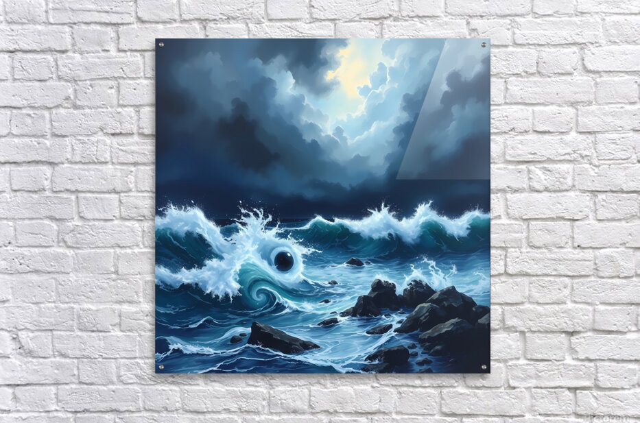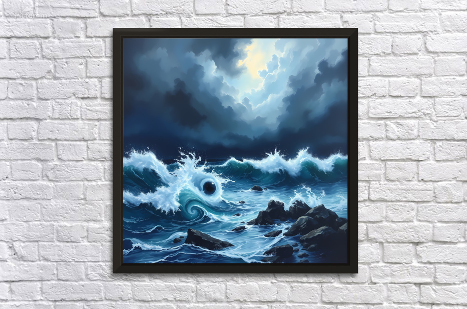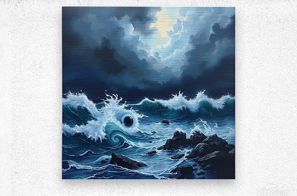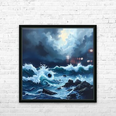 Immerse yourself in the power of nature with this dramatic seascape artwork depicting turbulent ocean waves and dark, moody skies. The intense colors and dynamic movement create a captivating piece that brings the energy of the sea into any space.