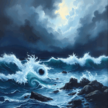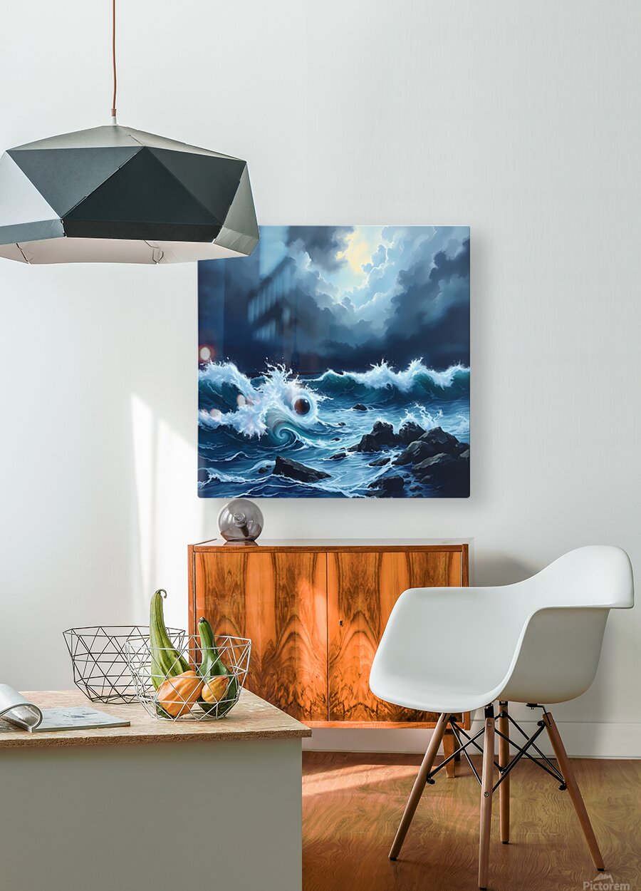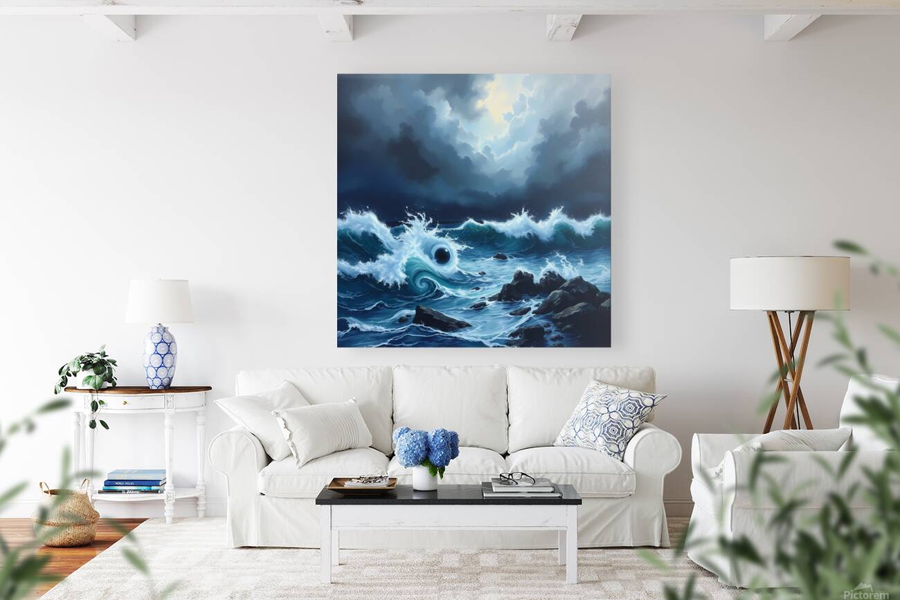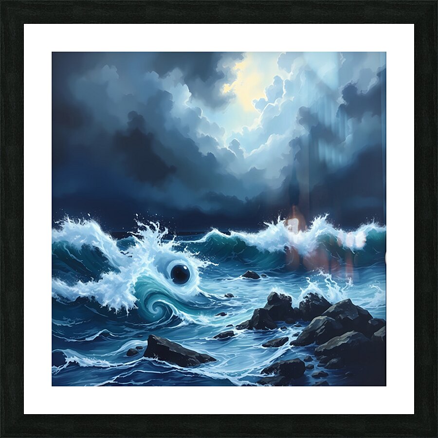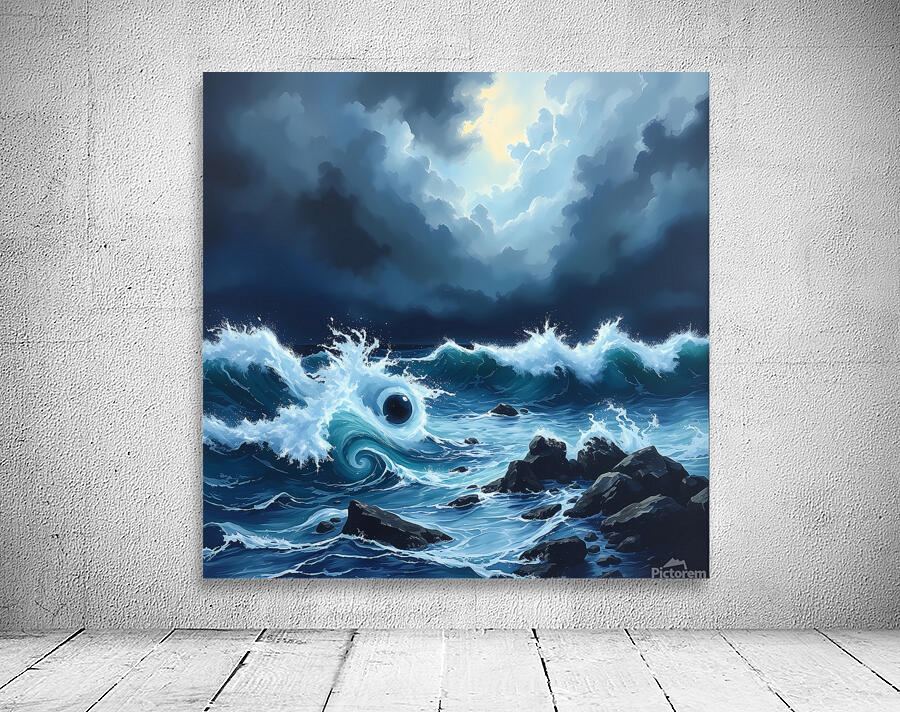 Immerse yourself in the power of nature with this dramatic seascape artwork depicting turbulent ocean waves and dark, moody skies. The intense colors ...[+]