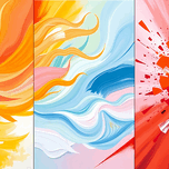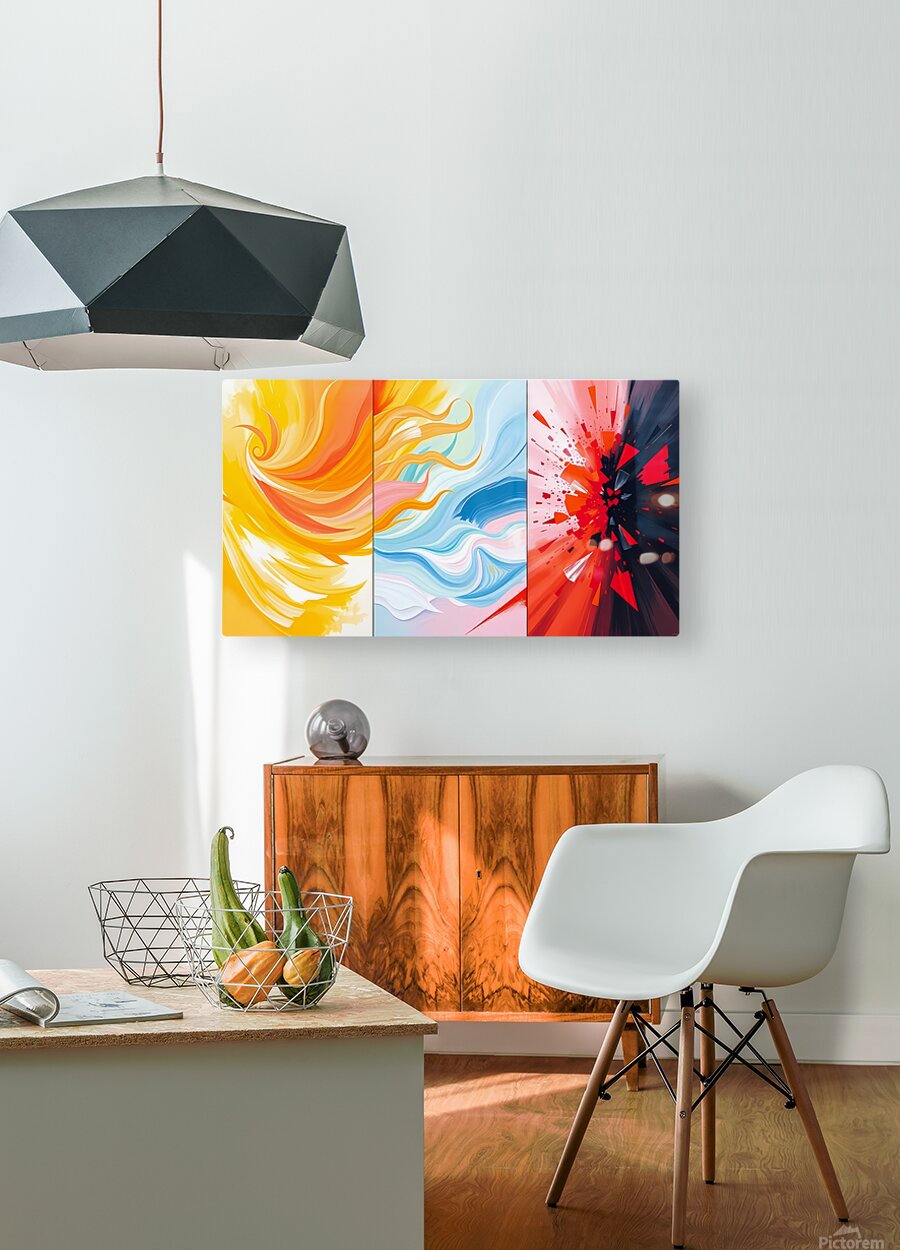 Experience the vibrant flow of energy with this abstract triptych artwork, featuring bold swirls of yellow, serene blues, and explosive reds. Each pan...[+]