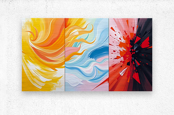 Experience the vibrant flow of energy with this abstract triptych artwork, featuring bold swirls of yellow, serene blues, and explosive reds. Each panel captures movement and emotion, making it a striking addition to any modern decor.