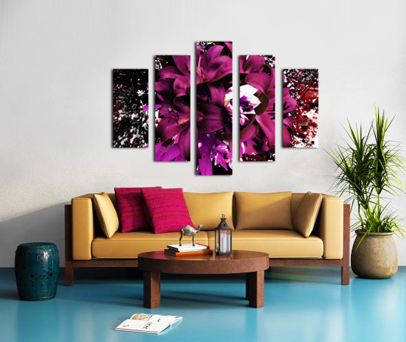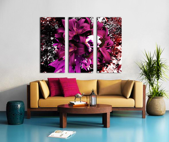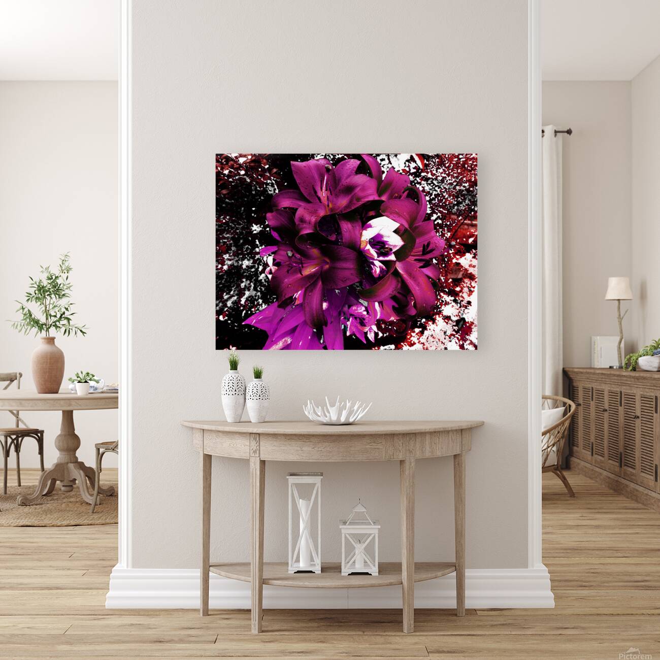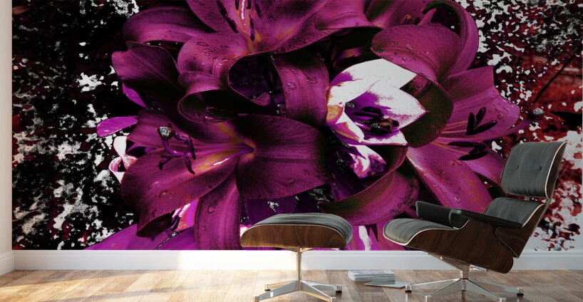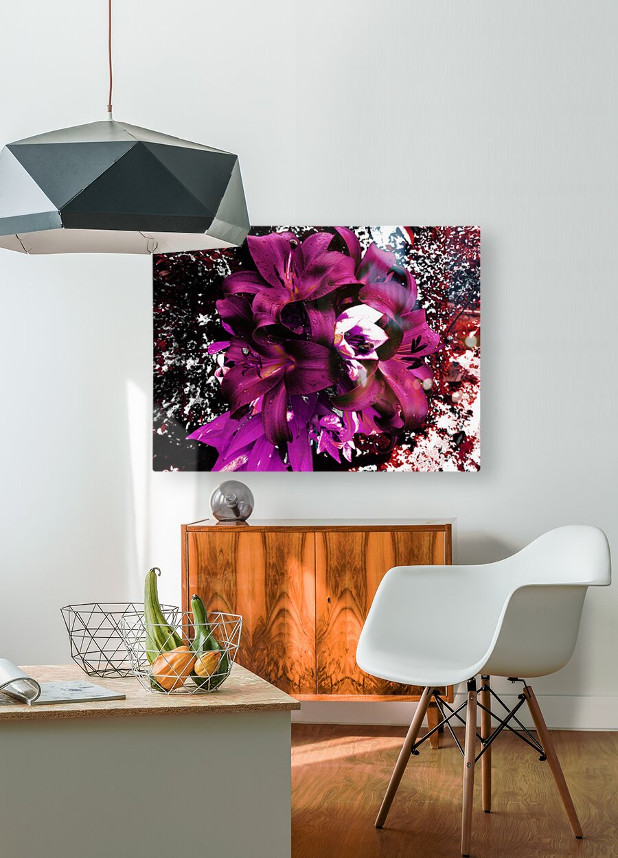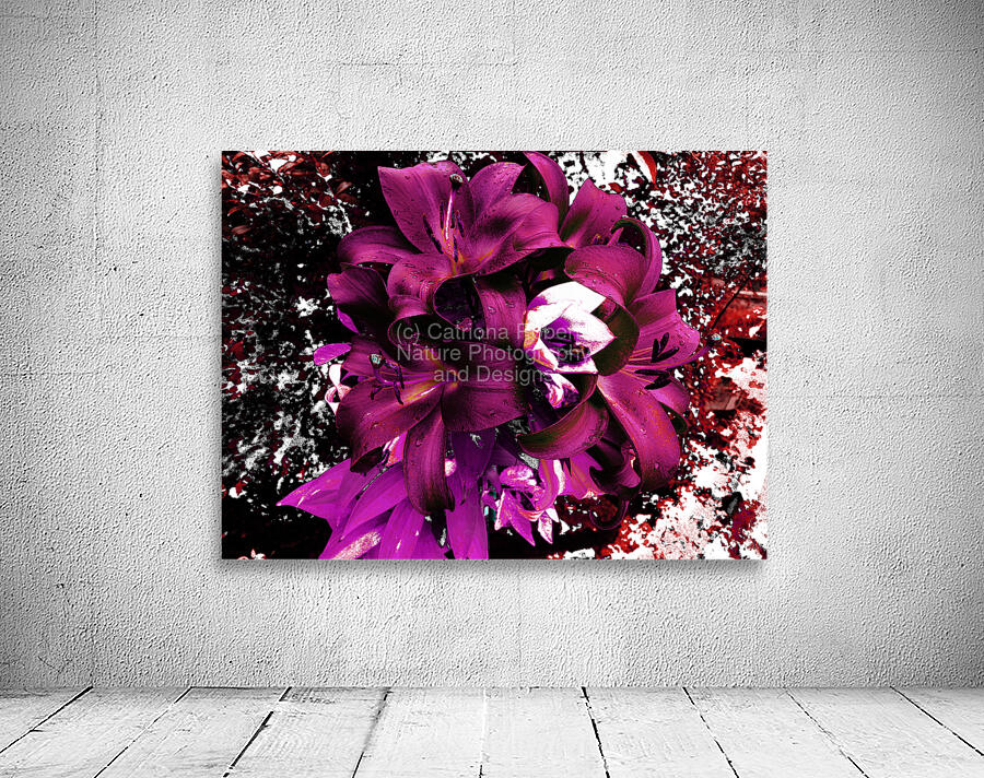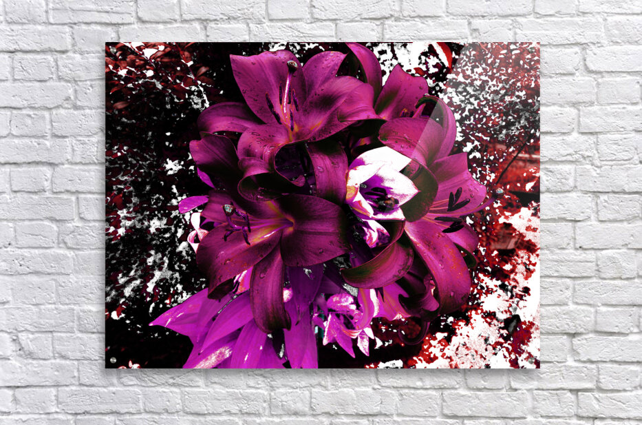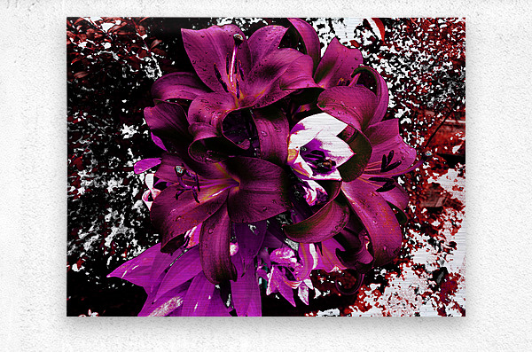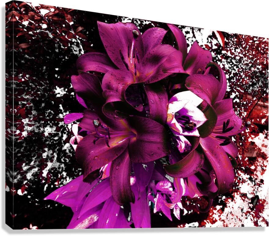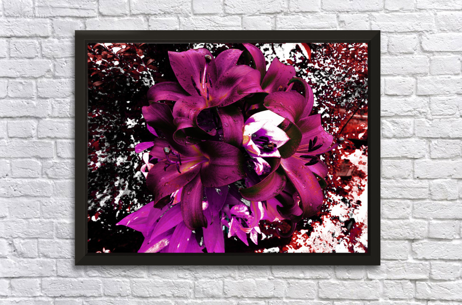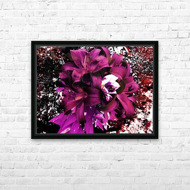 Originally a photo of Lily flowers laterally digitally manipulated into a stunning piece of contemporary floral art. Features vibrant purple Lilies as they take center stage, surrounded by a striking contrast of dark and light shades. The petals are richly colored, adding a dramatic effect to the entire composition.