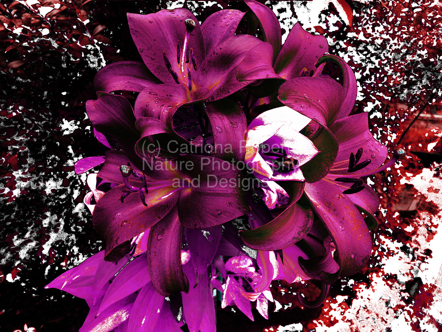 Originally a photo of Lily flowers laterally digitally manipulated into a stunning piece of contemporary floral art. Features vibrant purple Lilies as...[+]