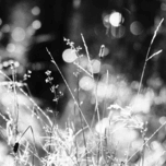 A black and white photo taken using a grainy monochrome artistic filter. Features delicate grasses and wild plants captured in black and white, creating a serene and ethereal scene. Light bokeh in the background adds a dreamy, soft focus effect.