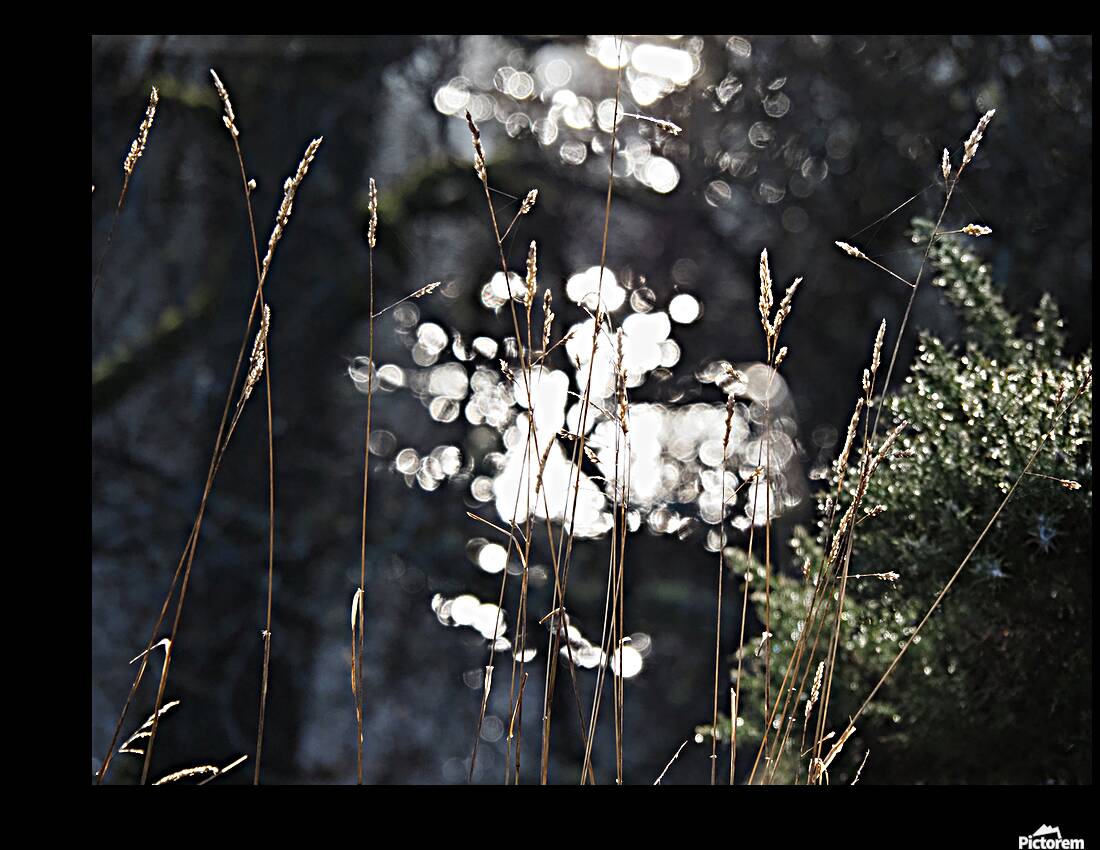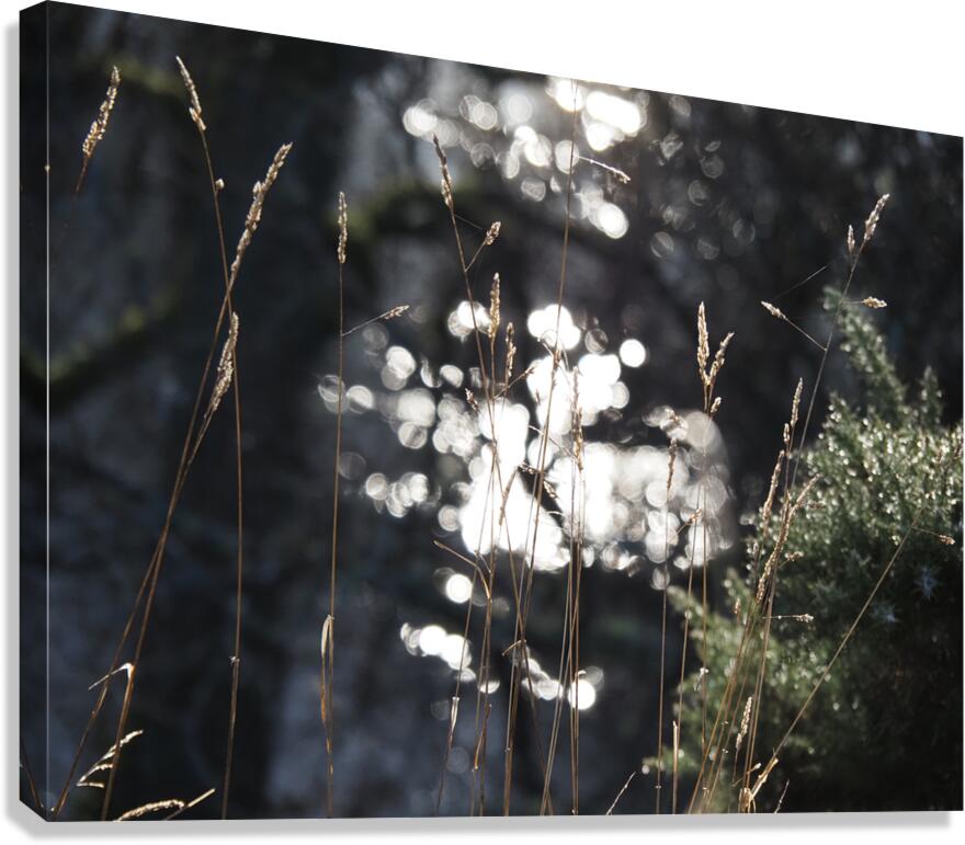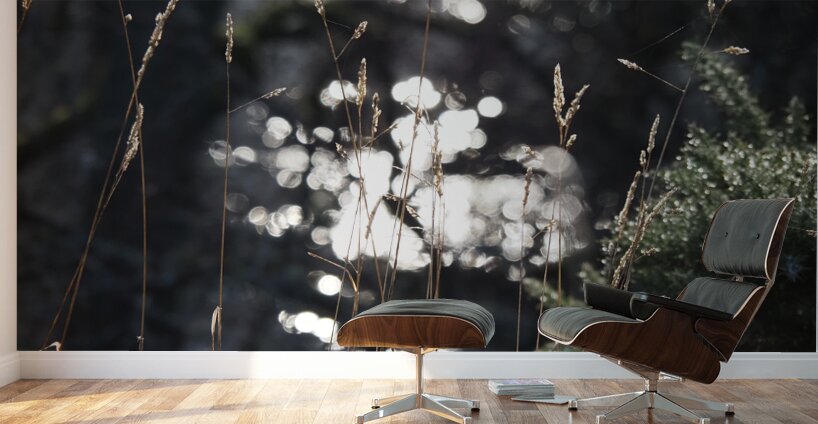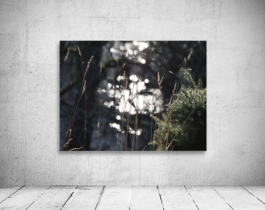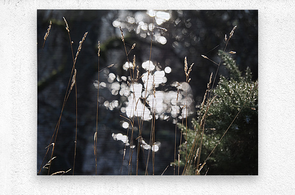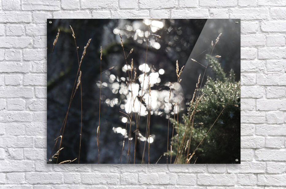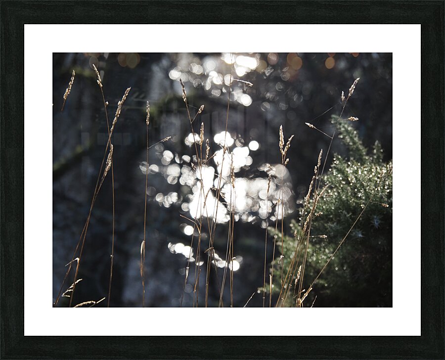 I took this photo during a lovely spring nature walk along a river in the Scottish Highlands. Features delicate blades of dried grass gently sway in the foreground, set against a backdrop of sparkling, bokeh, out-of-focus light reflections. The scene gives a sense of tranquility with natural greenery adding a touch of life to the composition.