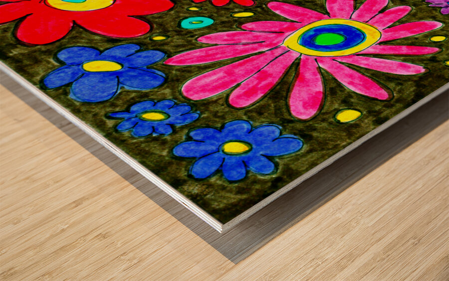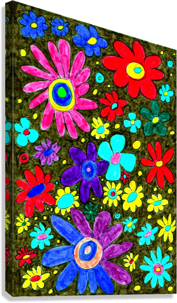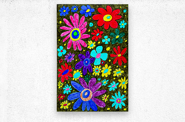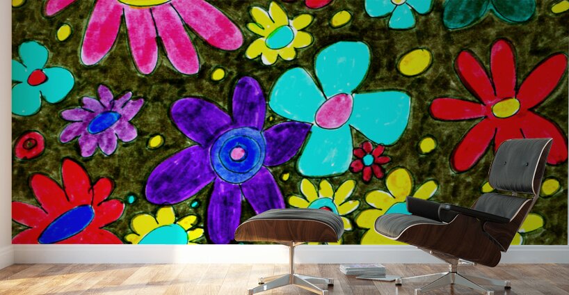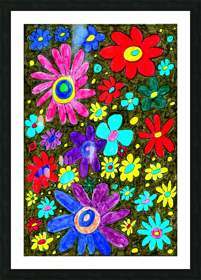 A hand drawn design created using coloured ink pens and paper, laterally digitally colour enhanced to create an appealing piece of vibrant floral doodle artwork. Features brightly colored flowers in various shapes and sizes filling the space, creating a vibrant and lively pattern. The bold use of colors such as red, blue, pink, and yellow contrasts against a dark background, adding a cheerful and whimsical feel.