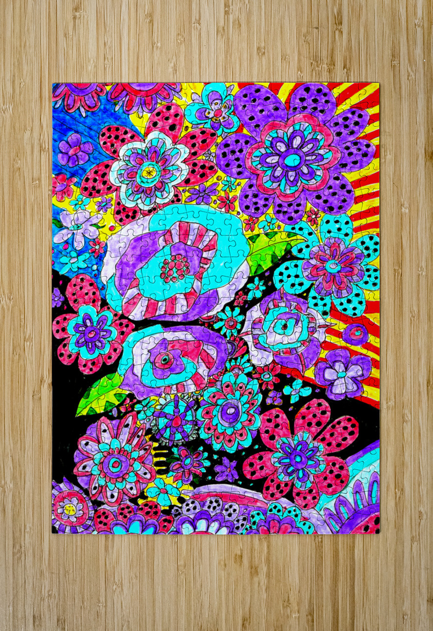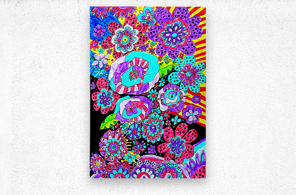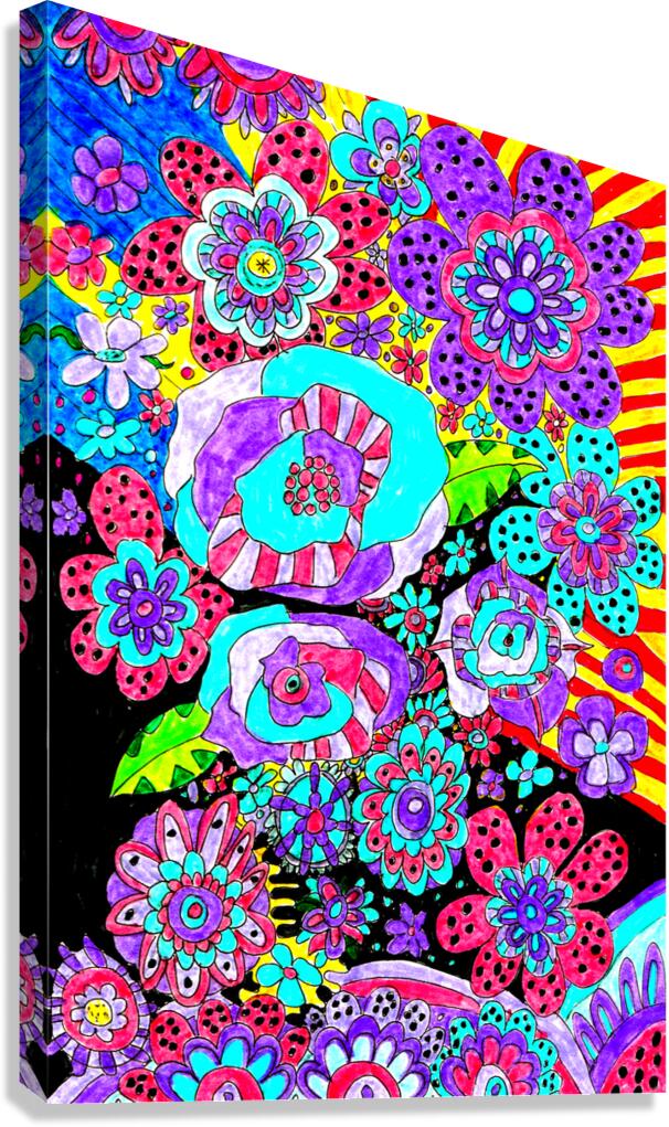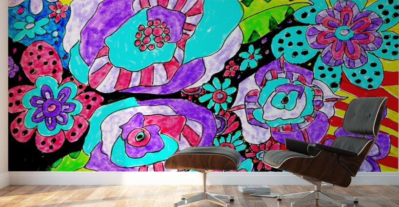 A doodle inspired design created using coloured ink pens and paper laterally digitally colour enhanced to create a cute doodle inspired floral design. Features vibrant and colorful floral patterns covering the entire scene, showcasing various abstract flower designs in vivid hues of purple, red, and blue. The background includes dynamic stripes and dots, adding movement and contrast to the lively composition.
