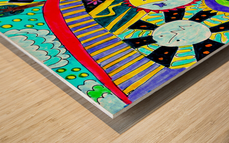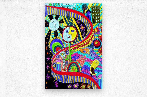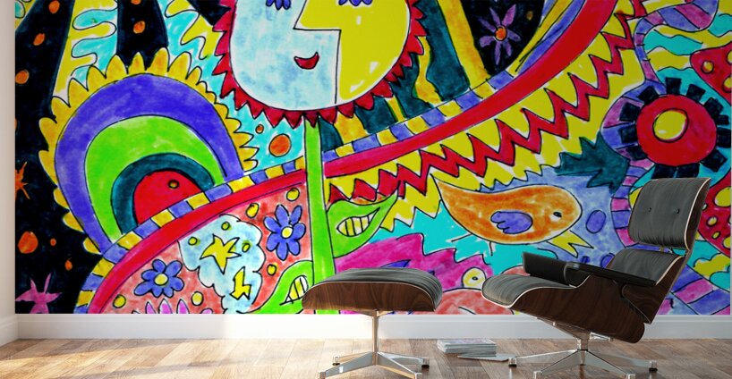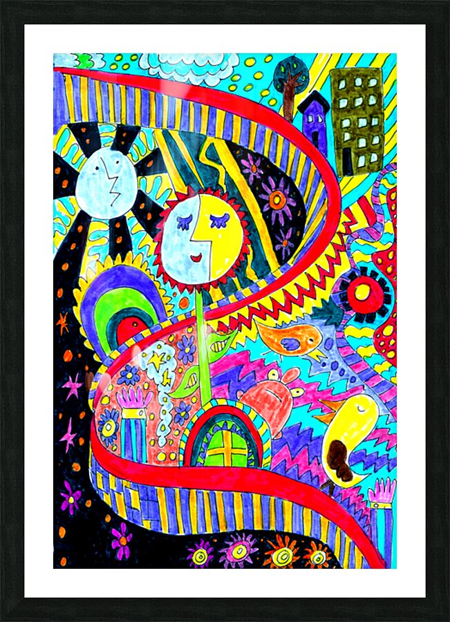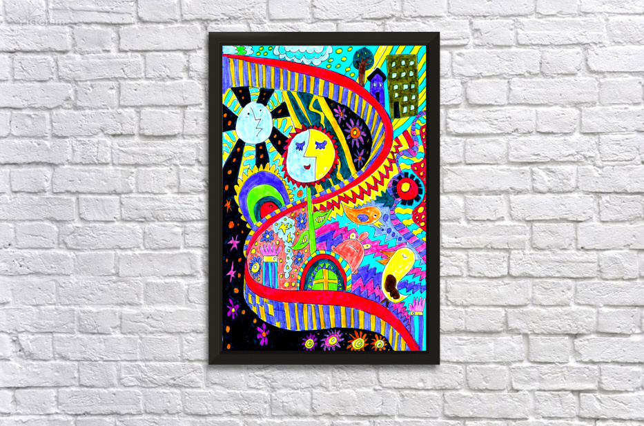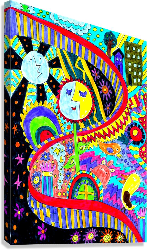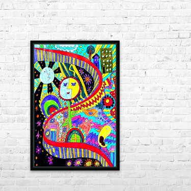 A doodle inspired design created using coloured ink pens and paper, laterally digitally colour enhanced to create a stunning piece of contemporary abstract art. Features a vibrant and colorful abstract scene showcasing swirling patterns and whimsical shapes, including smiling celestial bodies and a mixture of organic forms. Bright reds, yellows, and purples dominate the composition, creating a playful and dynamic atmosphere.