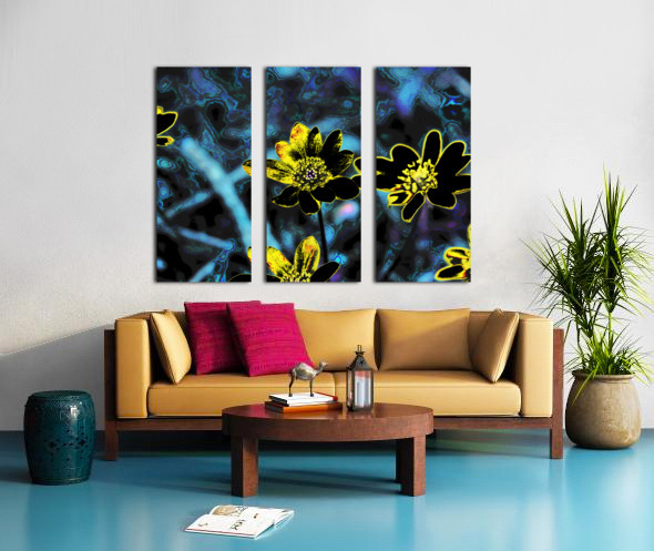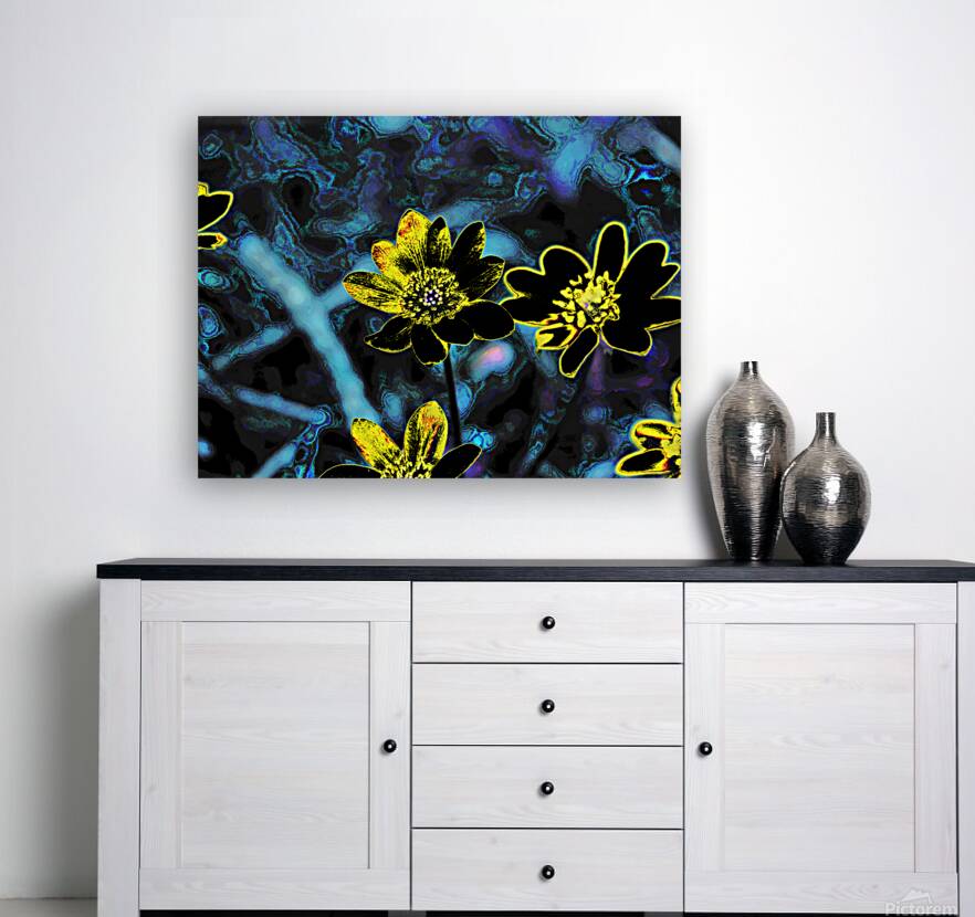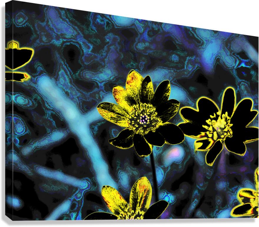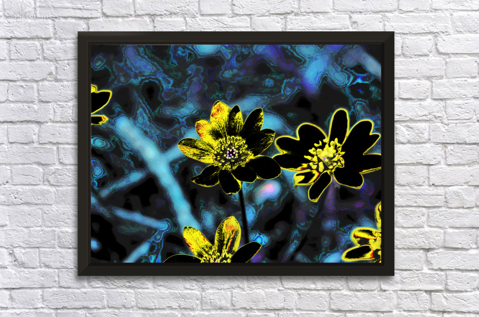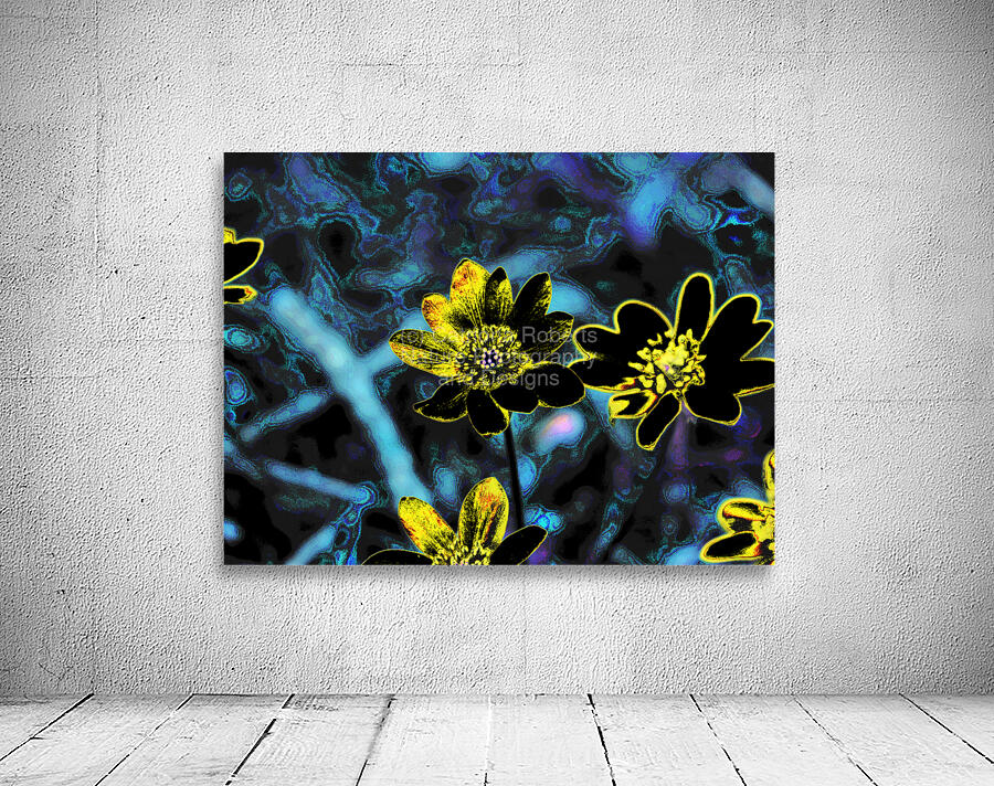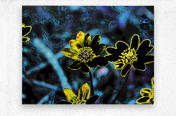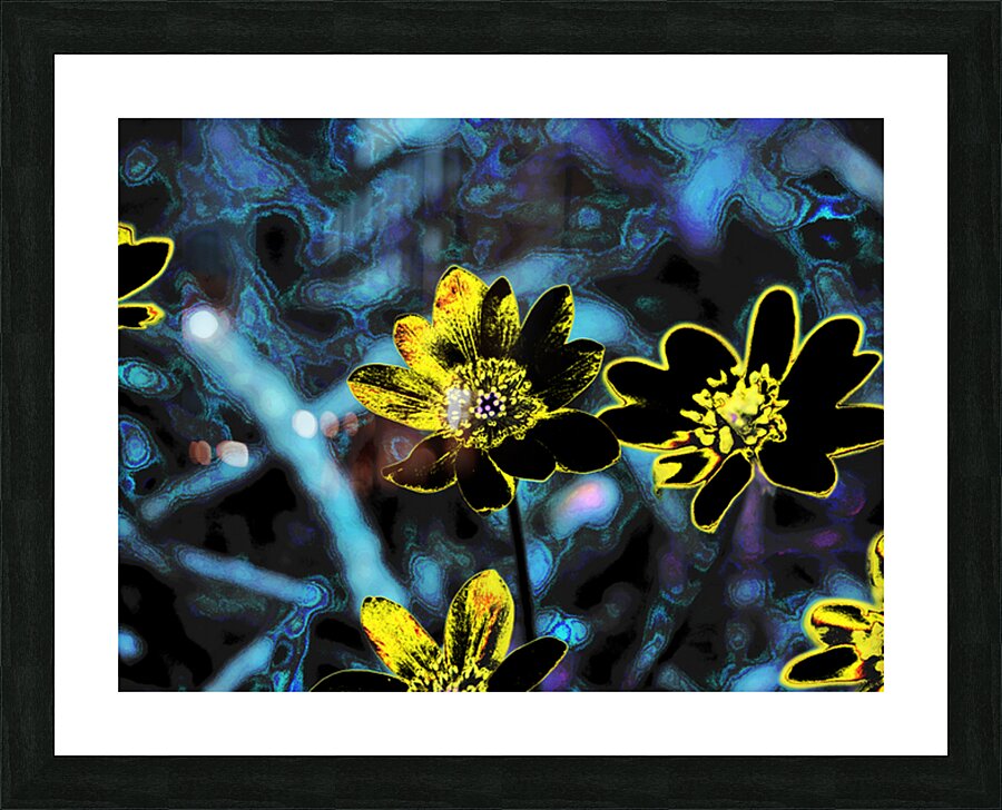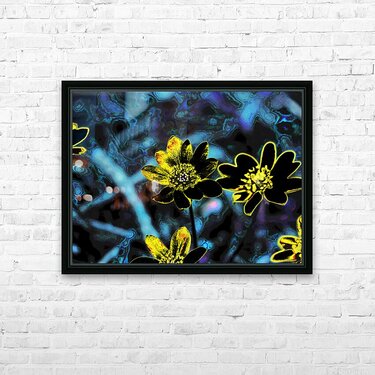 Originally a coloured photo of flowers laterally digitally edited to create a stunning piece of contemporary floral art. Features bright yellow flowers standing out against a dark, swirling background, creating a striking contrast. The blue and purple hues in the background enhance the vividness of the flowers, giving the scene a surreal quality.
