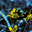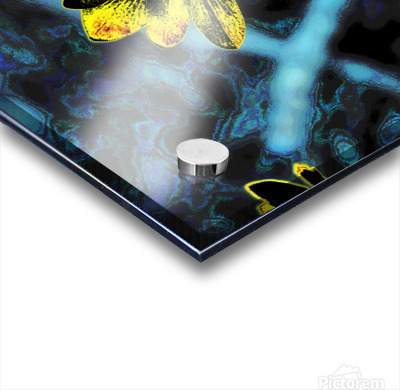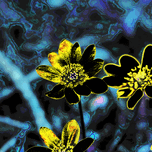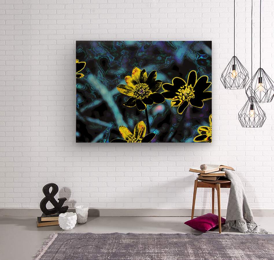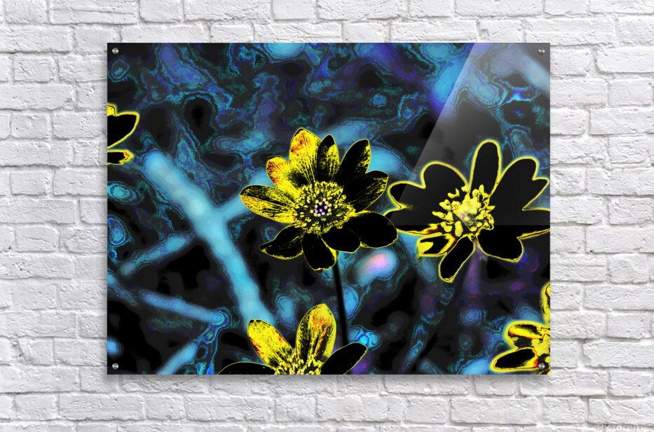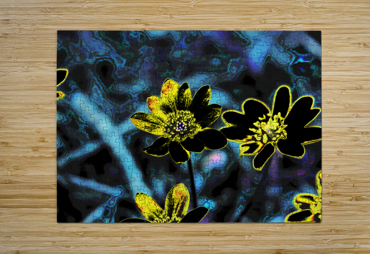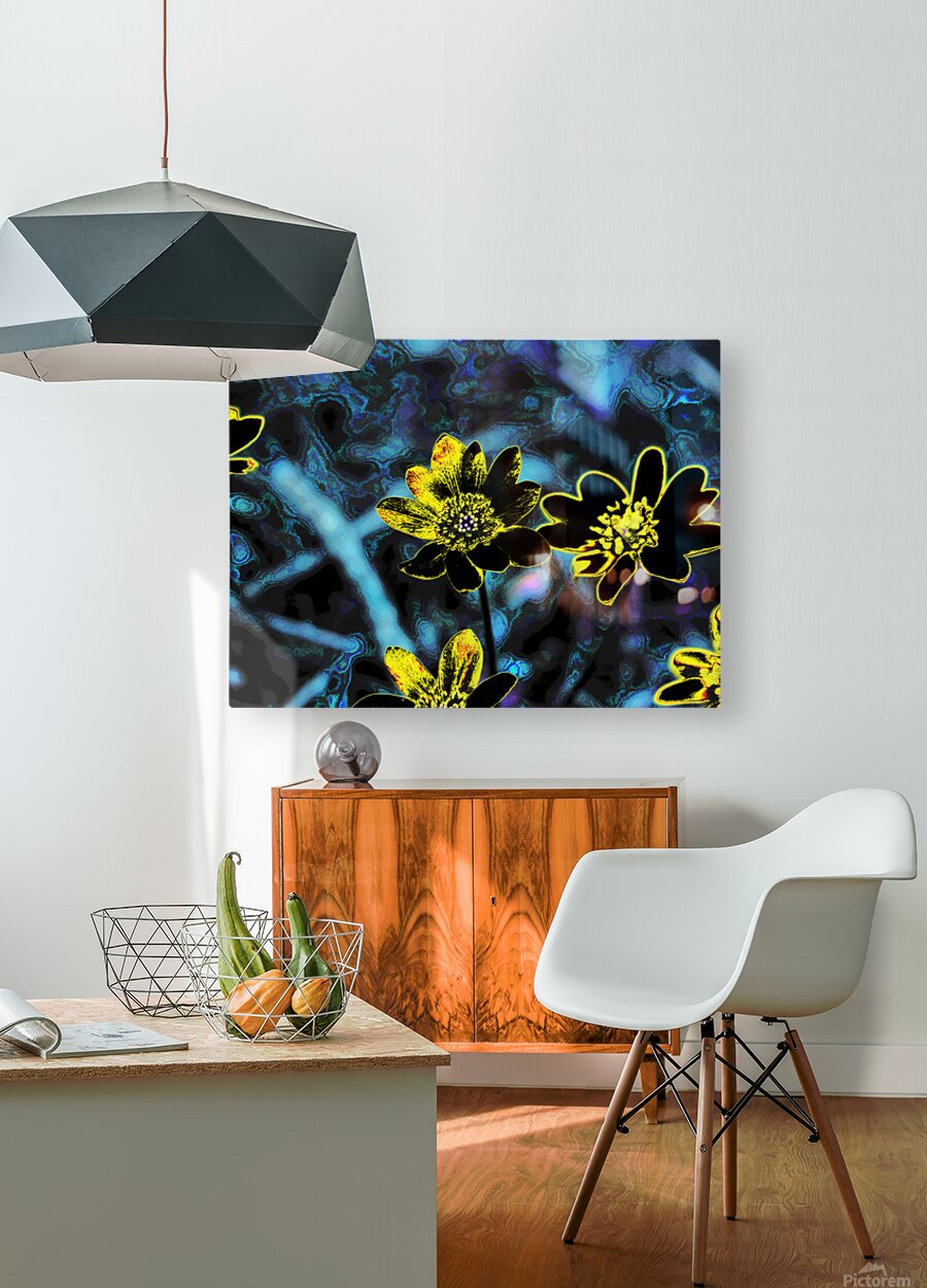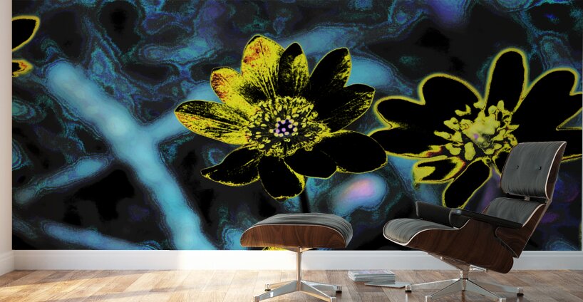 Originally a coloured photo of flowers laterally digitally edited to create a stunning piece of contemporary floral art. Features bright yellow flowers standing out against a dark, swirling background, creating a striking contrast. The blue and purple hues in the background enhance the vividness of the flowers, giving the scene a surreal quality.