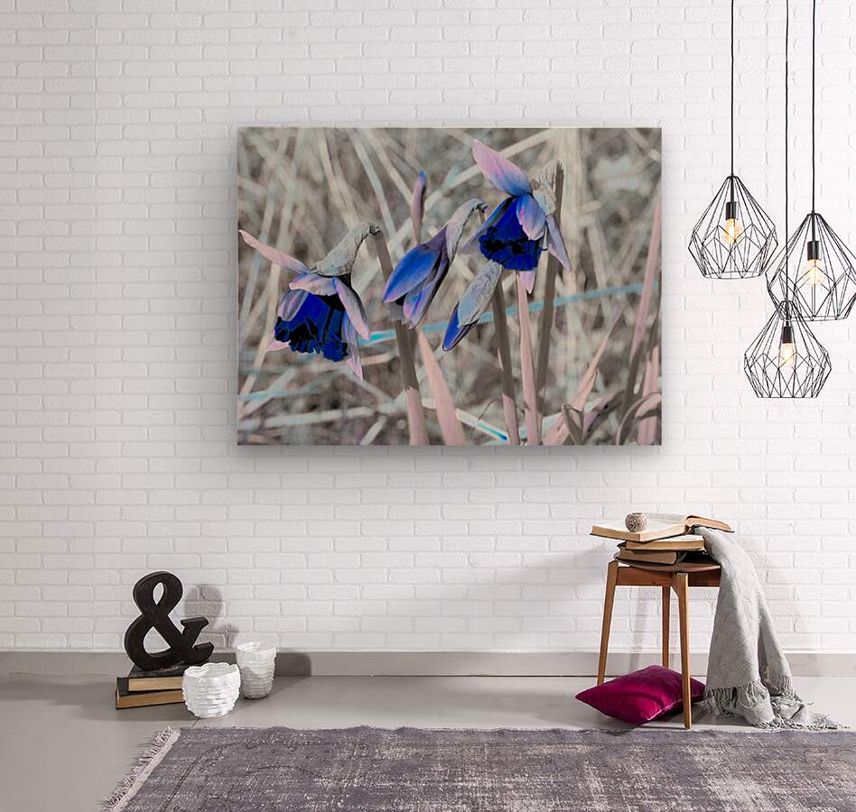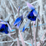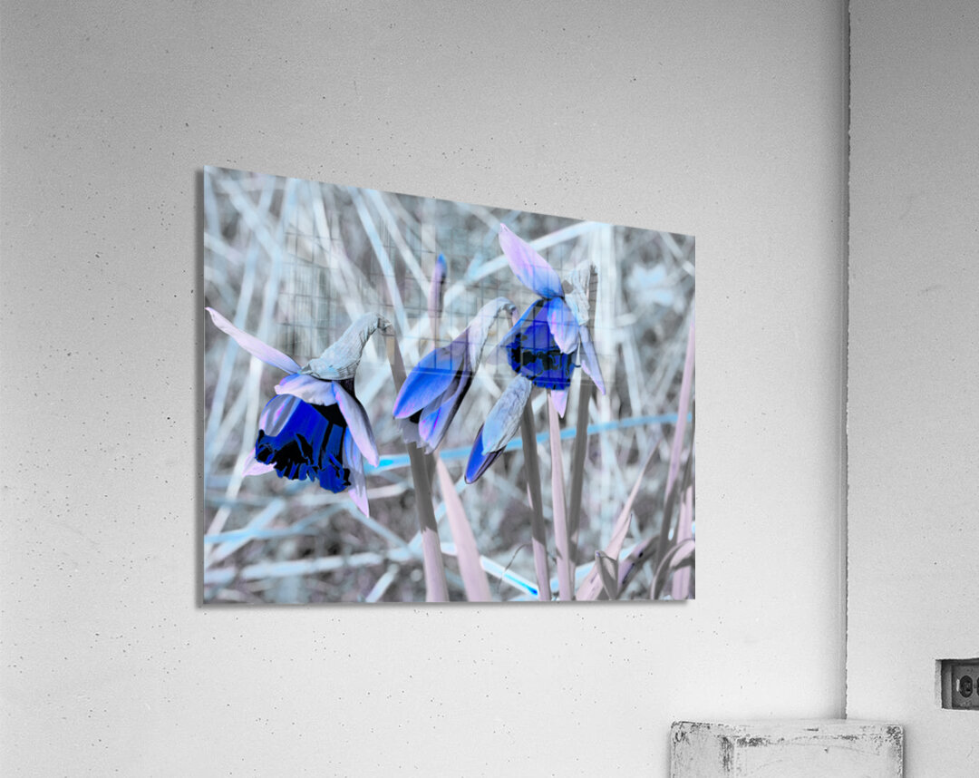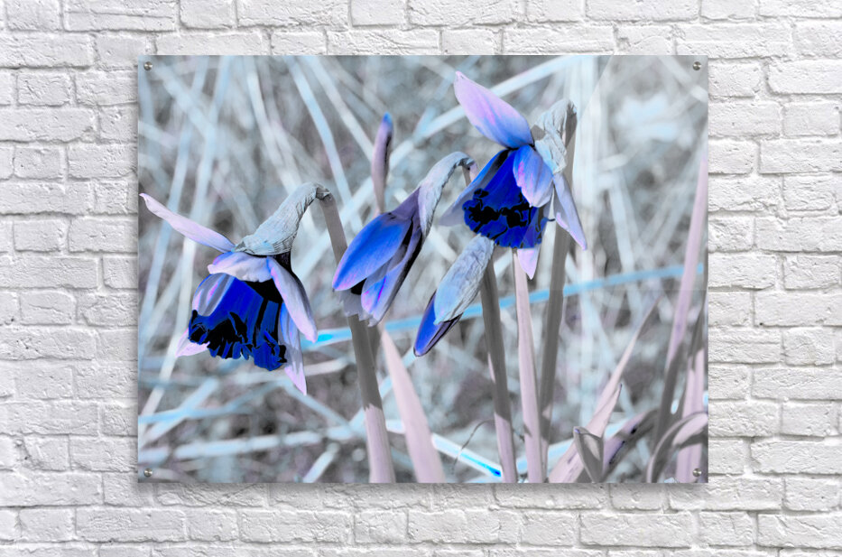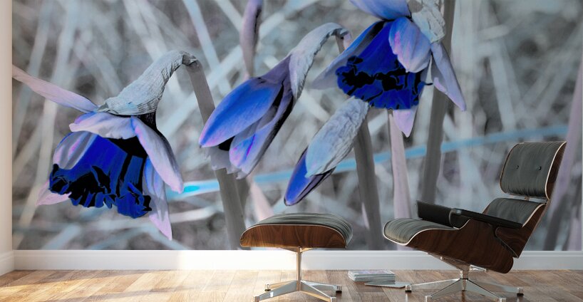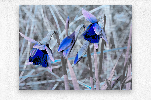 A coloured photo laterally digitally manipulated into a modern, contemporary floral art. Features lovely spring Daffodils displaying vivid blue petals against a muted background, creating a striking contrast. The scene suggests a touch of surrealism with an unusual color palette.
