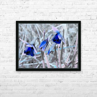 A coloured photo laterally digitally manipulated into a modern, contemporary floral art. Features lovely spring Daffodils displaying vivid blue petals...[+]