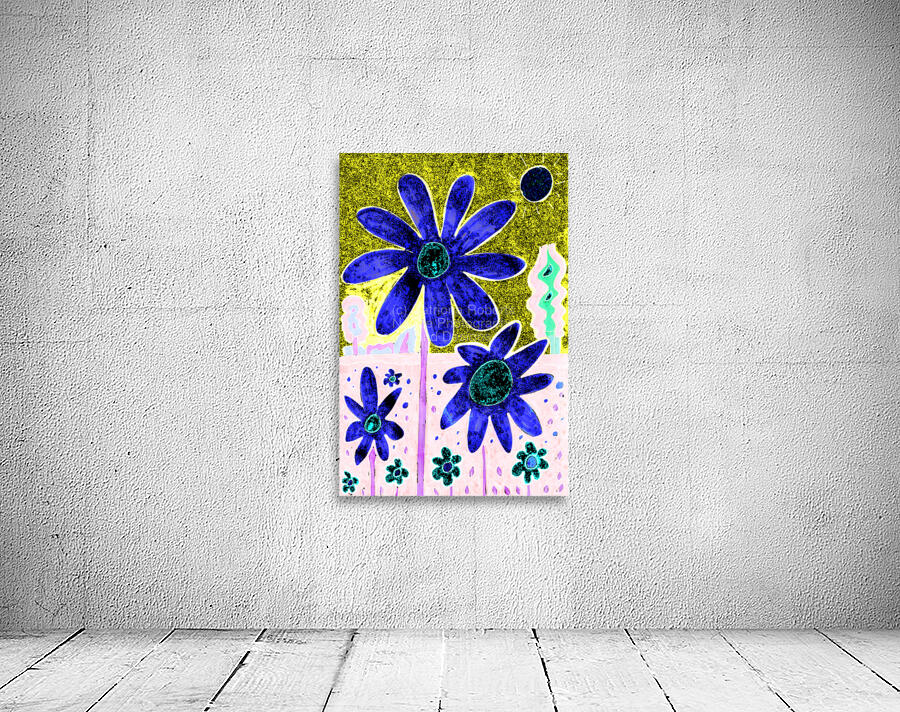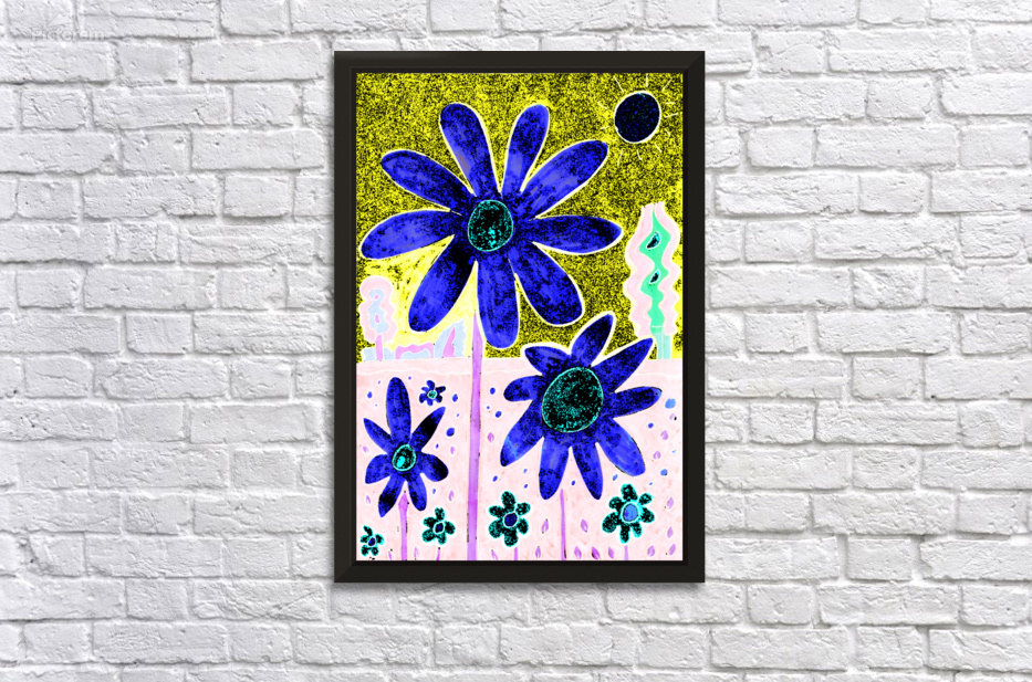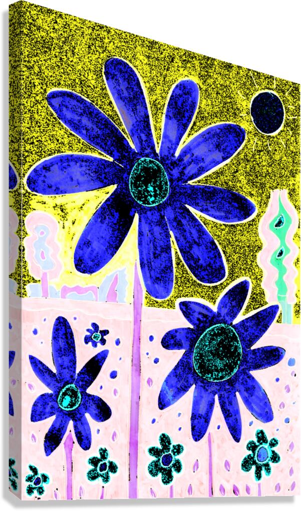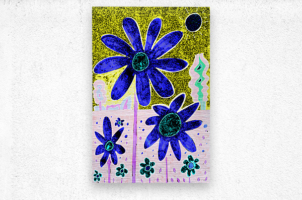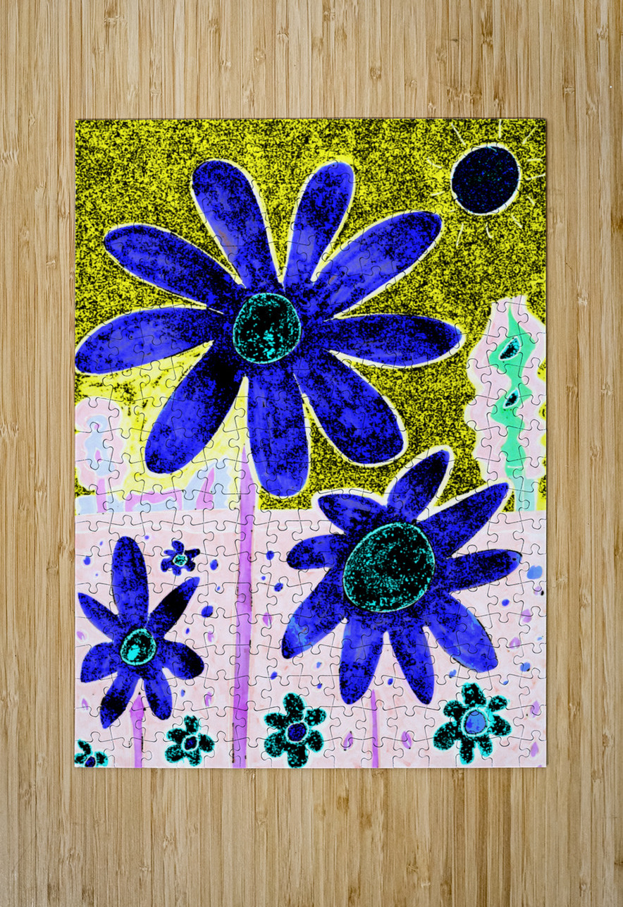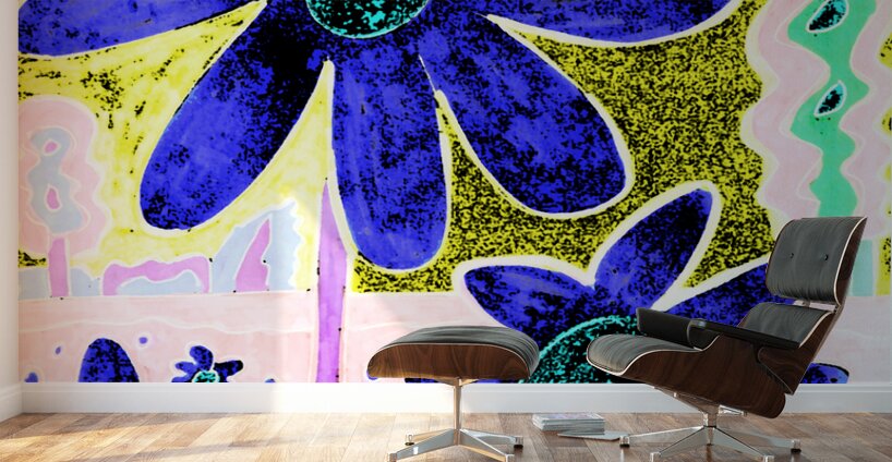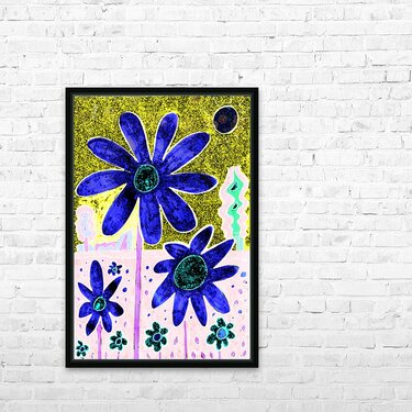A hand drawn design created from imagination using coloured ink pens and paper, laterally digitally manipulated into a cute floral abstract. Features vibrant purple flowers with textured petals standing against a bright yellow background, creating a striking contrast. The scene includes abstract shapes and pastel hues, adding whimsical elements to the composition.