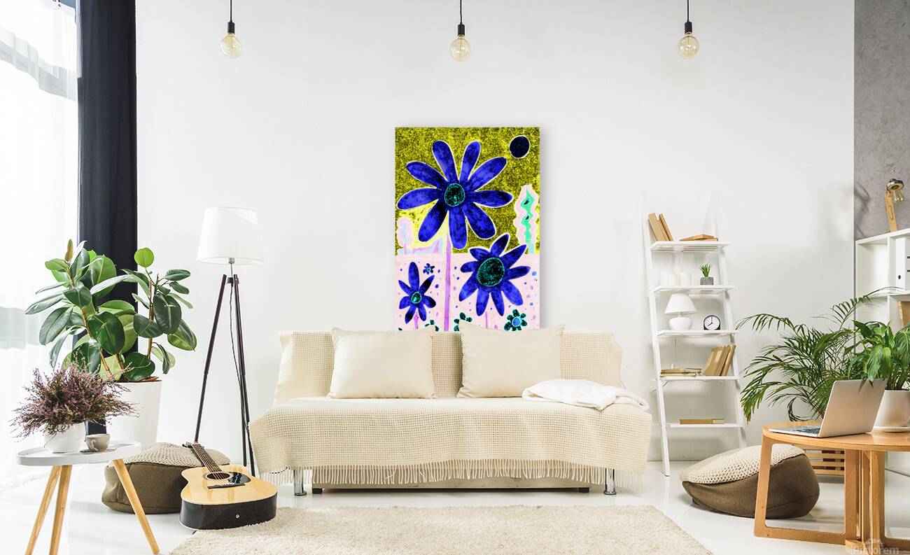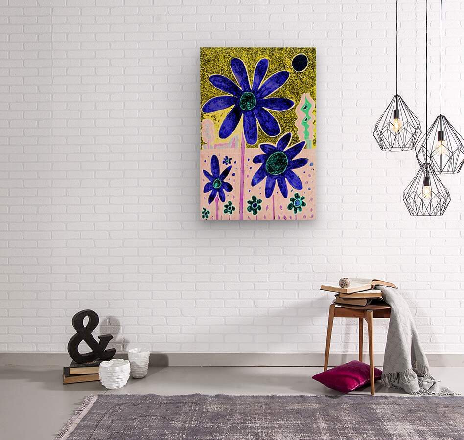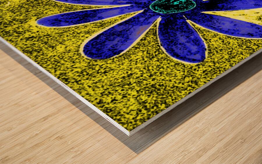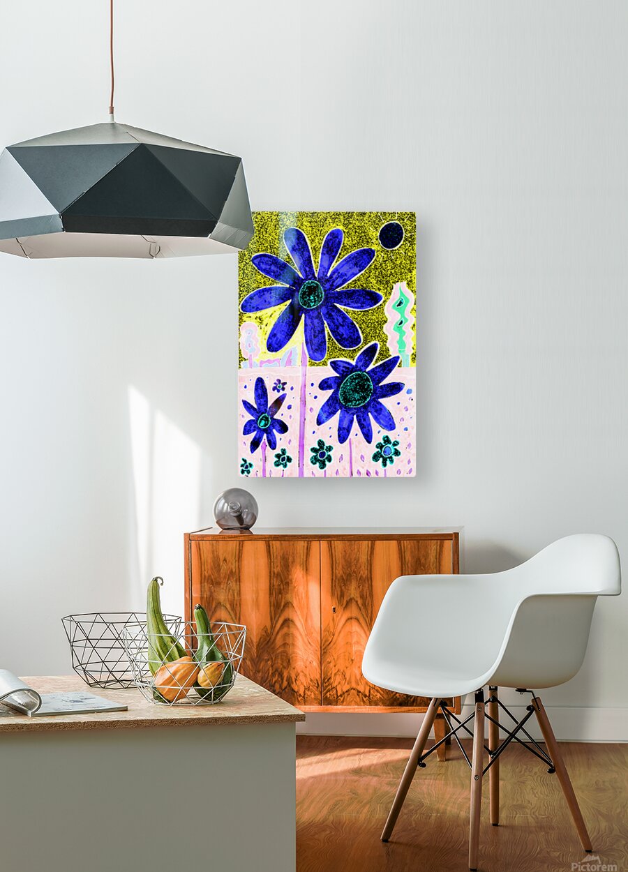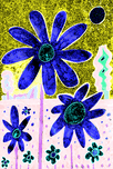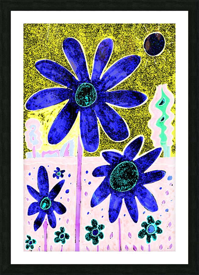 A hand drawn design created from imagination using coloured ink pens and paper, laterally digitally manipulated into a cute floral abstract. Features vibrant purple flowers with textured petals standing against a bright yellow background, creating a striking contrast. The scene includes abstract shapes and pastel hues, adding whimsical elements to the composition.