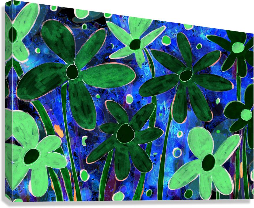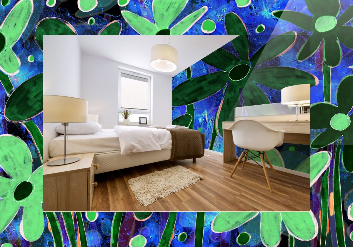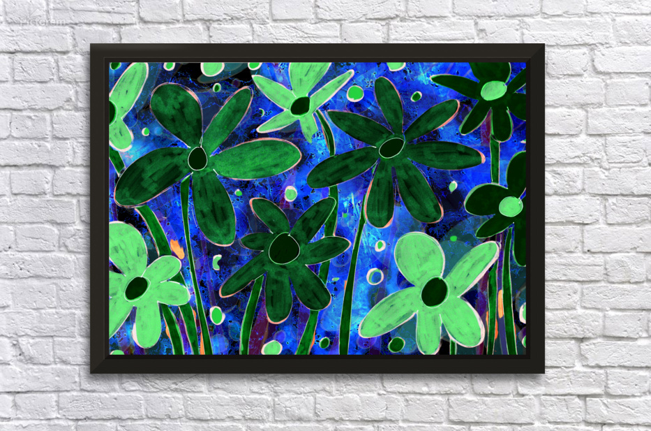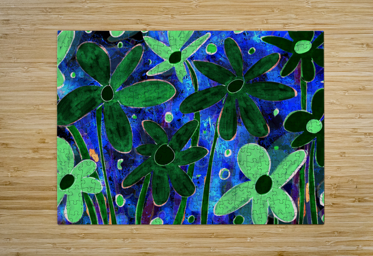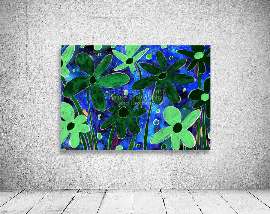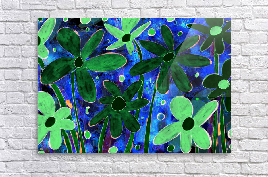 Originally a hand drawn design created from imagination using coloured ink pens and paper, laterally digitally manipulated into a stunning piece of abstract floral art. Features vibrant green flowers with large petals standing out against a deep blue background, creating a striking contrast. The composition includes swirling patterns and circular shapes that add a dynamic sense of movement.