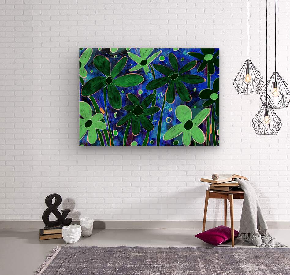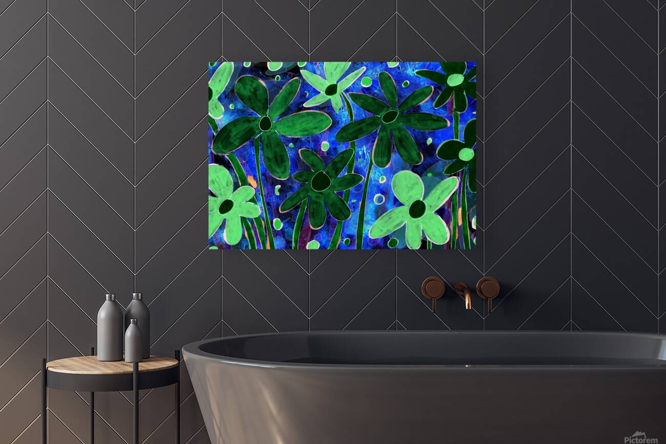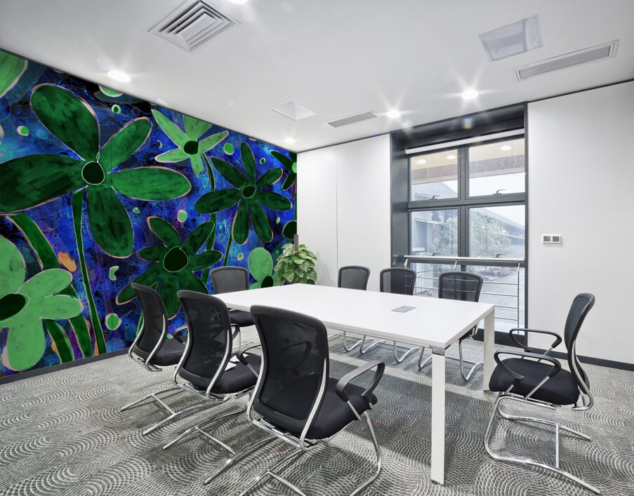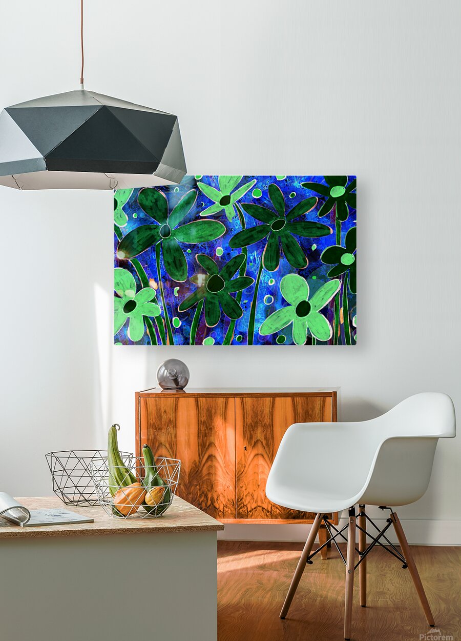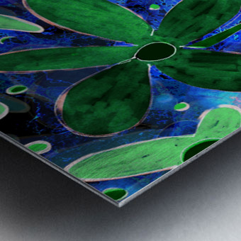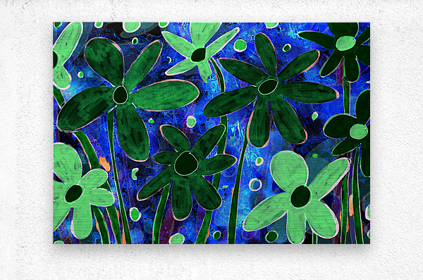 Originally a hand drawn design created from imagination using coloured ink pens and paper, laterally digitally manipulated into a stunning piece of abstract floral art. Features vibrant green flowers with large petals standing out against a deep blue background, creating a striking contrast. The composition includes swirling patterns and circular shapes that add a dynamic sense of movement.