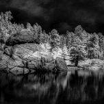 On a captivating afternoon I embarked on an expedition to Sylvan Lake nestled within the serene embrace of Custer State Park South Dakota. Armed with my camera I ventured to immortalize this natural wonders enigmatic allure. Amidst the tranquil waters of Sylvan Lake I encountered a spectacle that captured my gaze: a colossal rock protruding majestically from the depths below. Through the lens of my camera bathed in true black and white invisible light the scene took on an ethereal quality shrouded in mystery and intrigue. The monochrome palette lent an air of timeless elegance to the landscape accentuating every contour and crevice of the imposing rock formation. Against the lakes still surface the rock stood as a silent sentinel a testament to the enduring power of natures handiwork. As I captured the scene with a click of my camera I was awestruck by the stark beauty that unfolded before me. The infrared imagery revealed a world unseen to the naked eye a realm of subtle contrasts and hidden depths waiting to be explored. In that fleeting moment amidst the quietude of Sylvan Lake I felt a profound sense of connection to the natural world. The monochrome marvel of the rock bathed in invisible light served as a poignant reminder of the timeless beauty that surrounds us waiting to be discovered and cherished.
