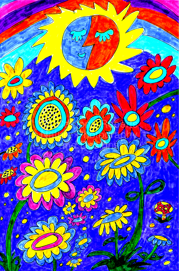 A hand drawn design laterally undergoing some colour digital enhancement. Features brightly colored flowers of various shapes and sizes filling a vibrant landscape beneath a cheerful, smiling sun in the sky. The scene is playful and lively, with a diverse array of reds, yellows, and blues adding dynamic energy.