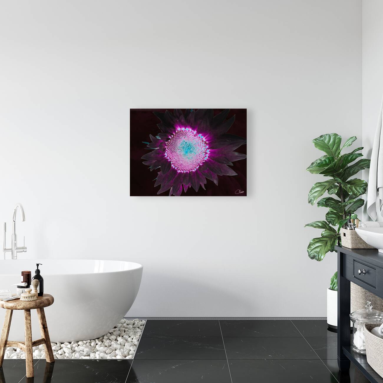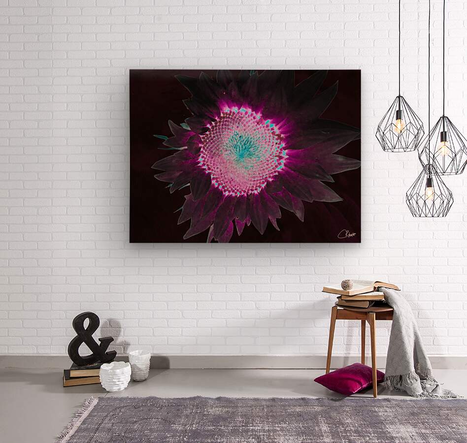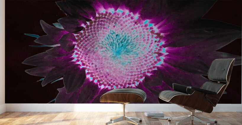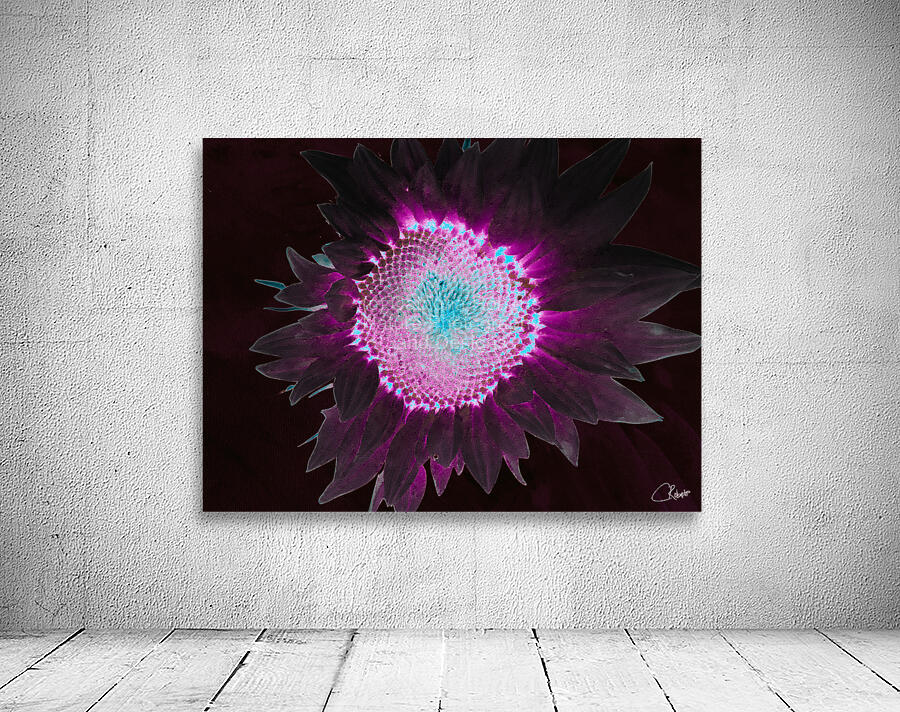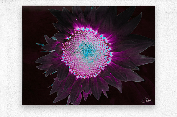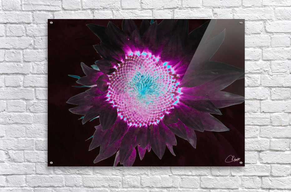Originally a hand painted acrylic and a close up photo of a Sunflower, laterally combined and digitally manipulated to create a stunning piece of contemporary floral art. Features a A brightly colored sunflower displaying a striking combination of neon purple and turquoise hues against a dark background. The vibrant colors create a glowing effect, enhancing the flower's intricate patterns.
