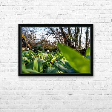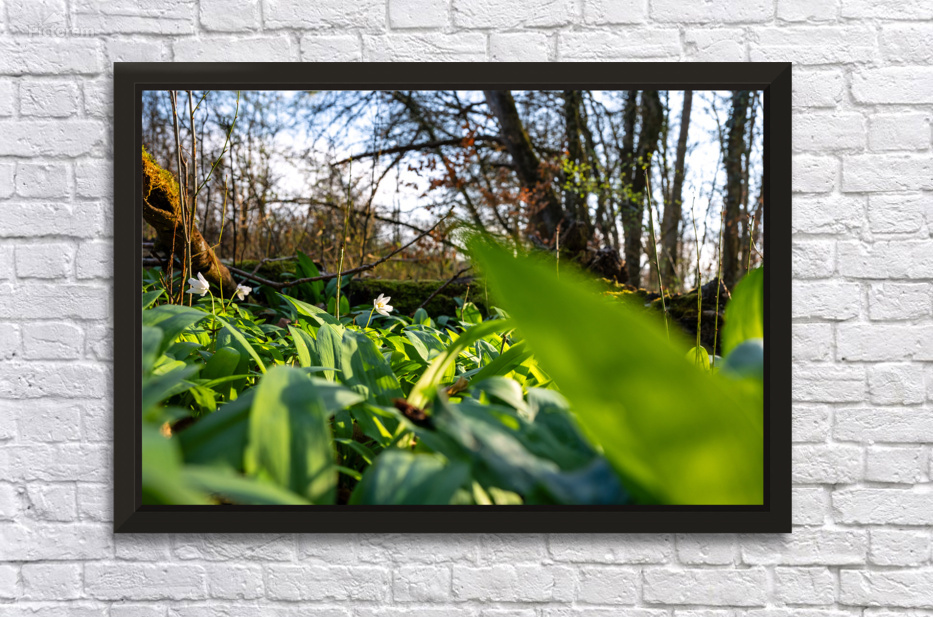 Closeup shot of wild garlic and thimbleweed in the beautiful forest in early spring at sunset Frame print