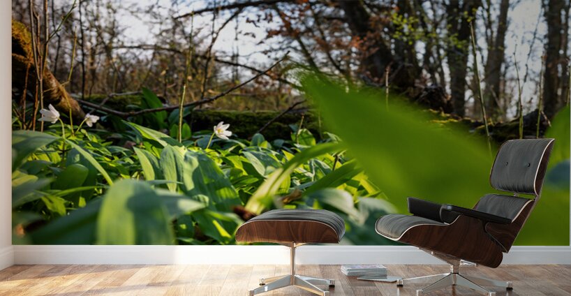 Get this artwork "Closeup shot of wild garlic and thimbleweed in the beautiful forest in early spring at sunset" in a framed print.