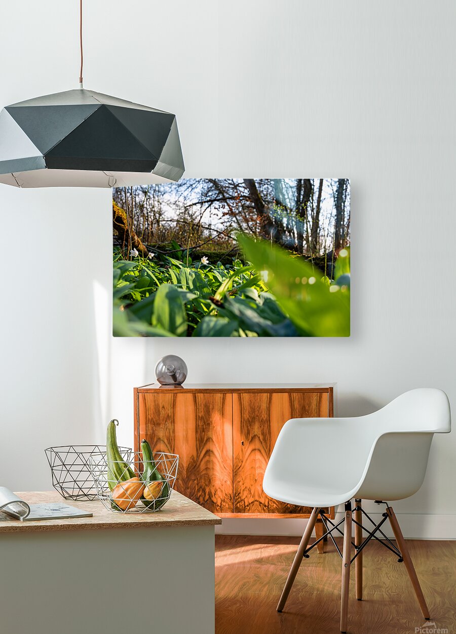 ABOUT THIS ARTWORK: CLOSEUP SHOT OF WILD GARLIC AND THIMBLEWEED IN THE BEAUTIFUL FOREST IN EARLY SPRING AT SUNSET