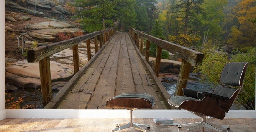 Cool rustic wooden walking hiking bridge crossing over a creek. A very nice grand entrance point of view for a beautiful autumn hike in the Rocky Mountains. This is over South St Vrain Creek in west Boulder County Colorado. Roosevelt National Forest.