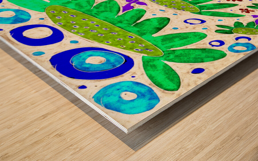 Originally a hand drawn design created using coloured ink pens and paper, laterally digitally manipulated. Features lush green flowers with dotted centers surrounded by smaller red blooms and swirling blue rings. The background features a light, textured design that complements the vibrant colors of the flora.