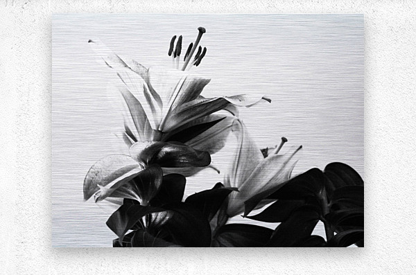 I took this photo using a creative photographic filter to give a grainy textured, monochrome effect. Features elegant lilies in bloom, captured in a black and white photograph, showcasing their intricate petals and prominent stamens. The contrast between the light petals and dark leaves adds depth and drama to the scene.