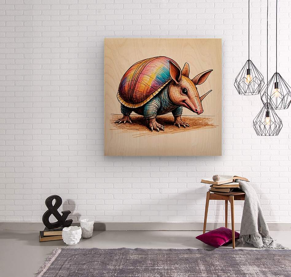 Default A cartoon armadillo curled up in a ball w  Wood print