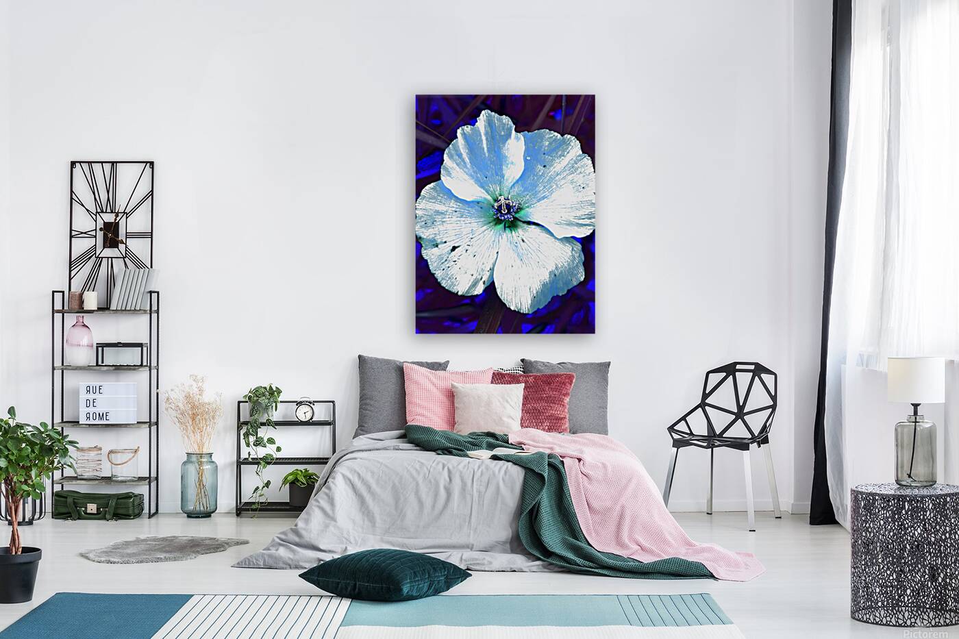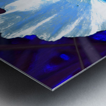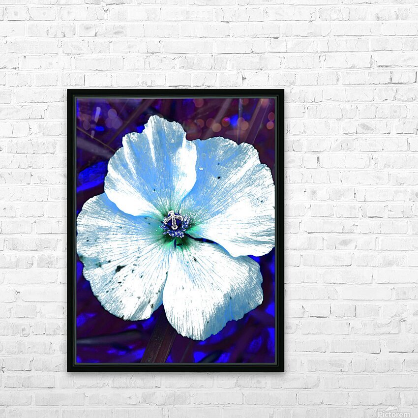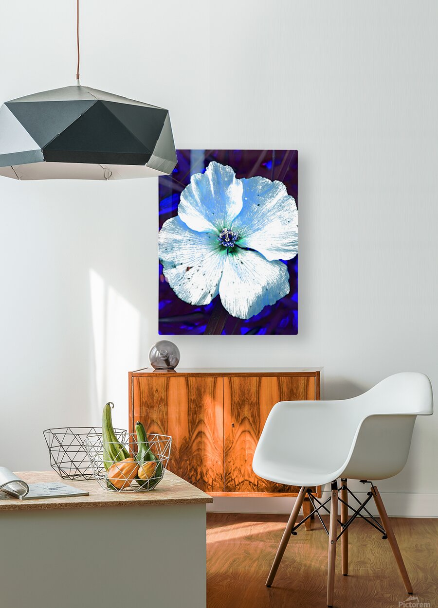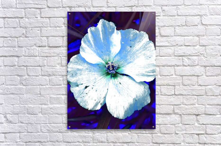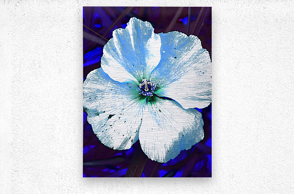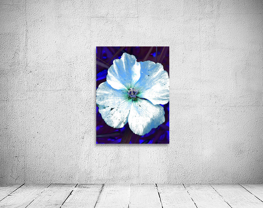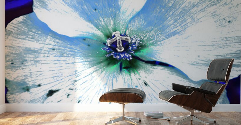 Originally a coloured photo of a wild poppy flower laterally digitally manipulated into a stunning piece of contemporary floral art. Features a single Poppy with delicate petals depicted with a striking contrast, highlighted by a blue and white color scheme. The vibrant blue background enhances its luminescent appearance, creating an ethereal atmosphere.