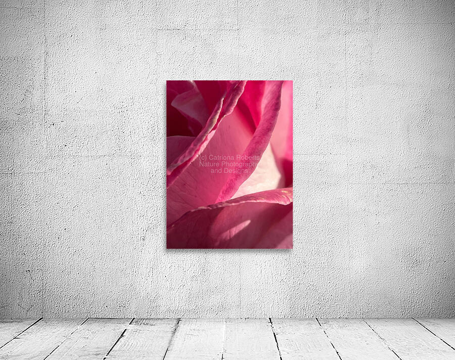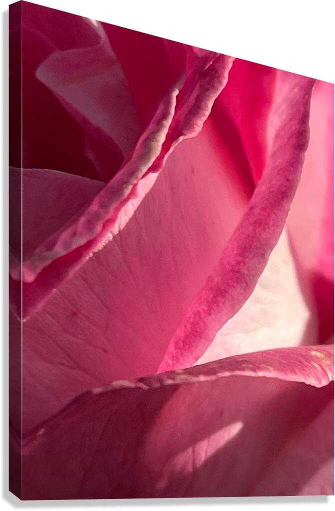 A close up photo of a Rose laterally digitally manipulated to create a stunning piece of floral contemporary art. Features a delicate pink Rose with petals folding into each other, creating a soft and mesmerizing pattern. Sunlight gently highlights the natural curves, enhancing the rich hues.