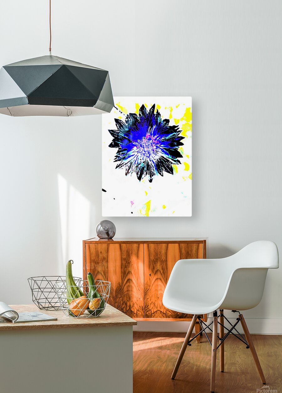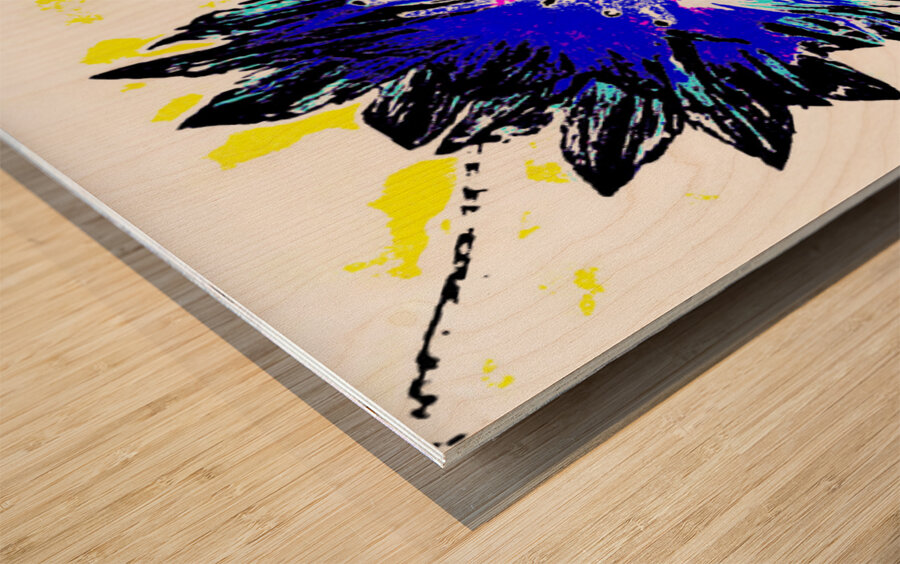 Originally a coloured photo of a wild flower laterally digitally manipulated into a stunning piece of contemporay floral art. Features a vibrant flower with bold, abstract colors of blue, black, and hints of pink standing out against a bright, high-contrast background. The petals are sharp and dynamic, creating an energetic, modern aesthetic.