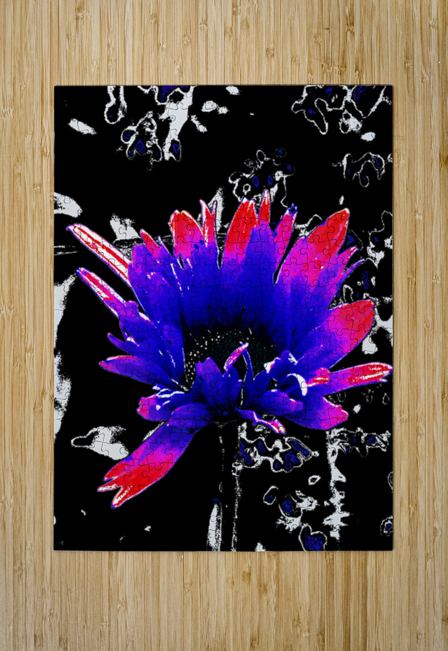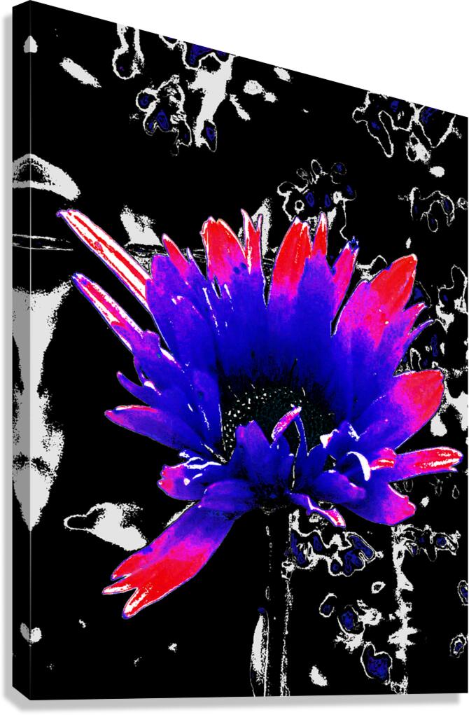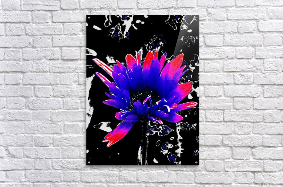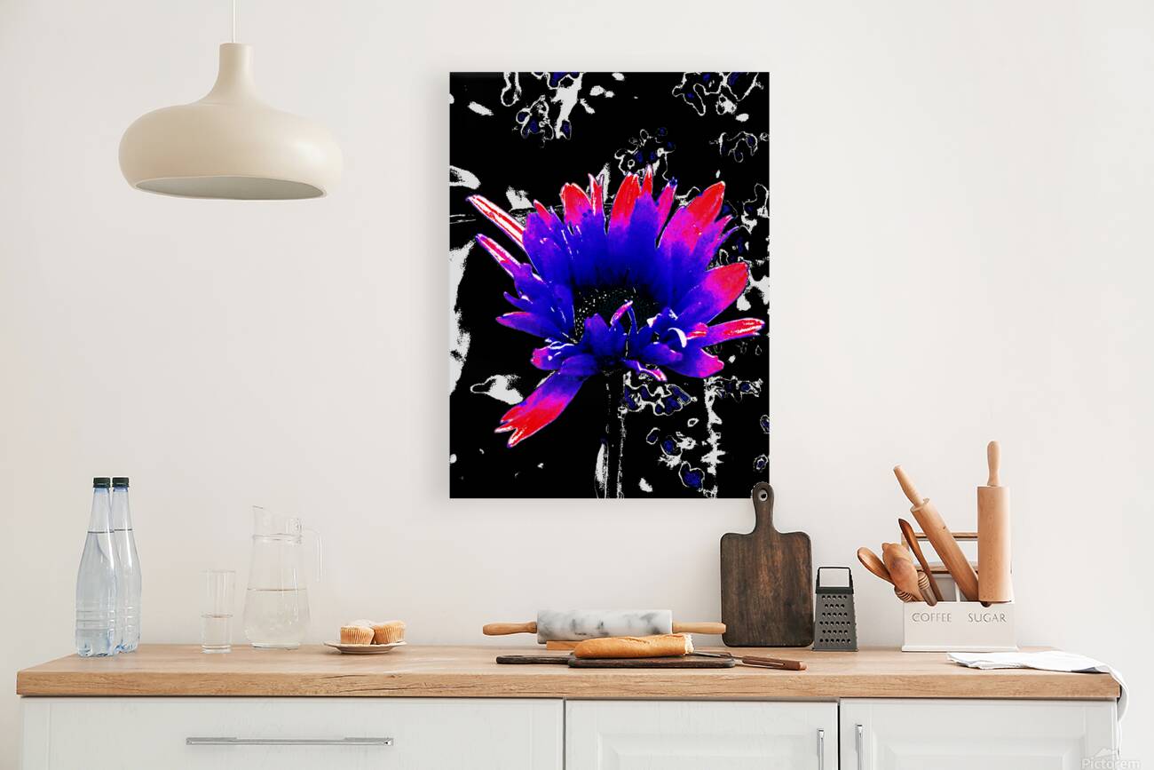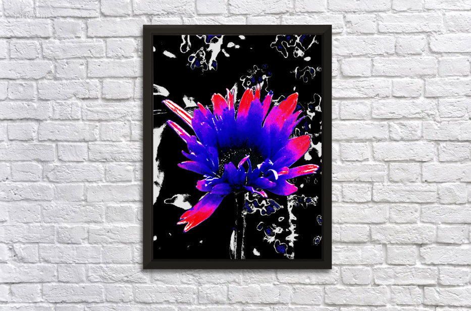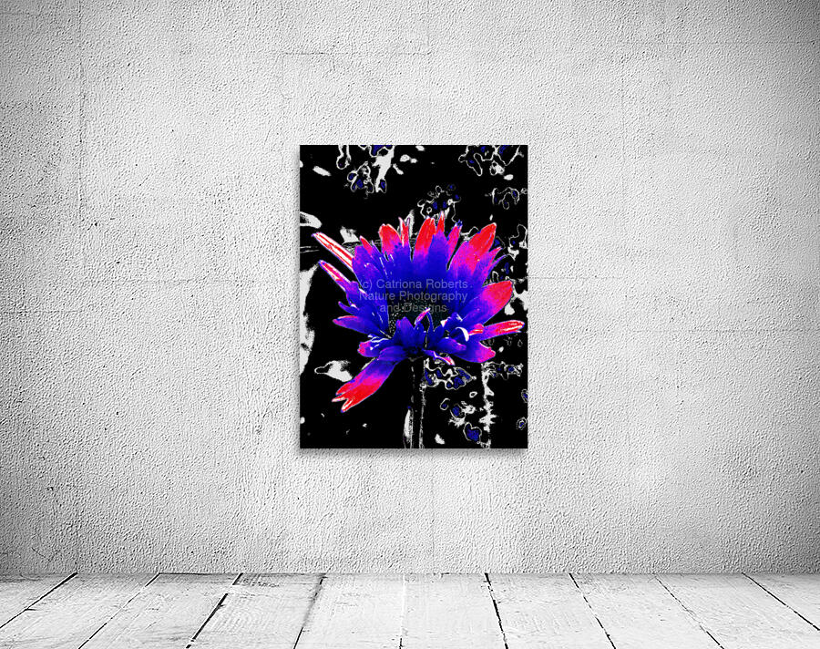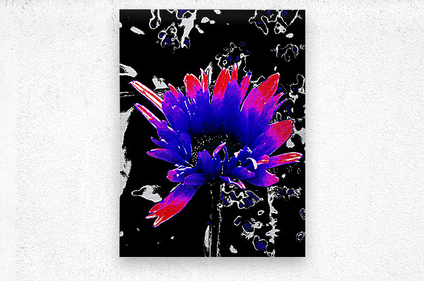 Originally a coloured photo of a Daisy laterally digitally manipulated into a stunning piece of contemporary floral art. Features a vibrant Daisy flower with electric blue and fiery red petals standing out against a dark, abstract background. Its bold colors create a striking contrast, making the flower the focal point of the composition.