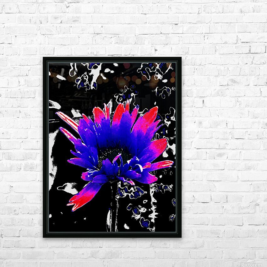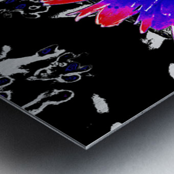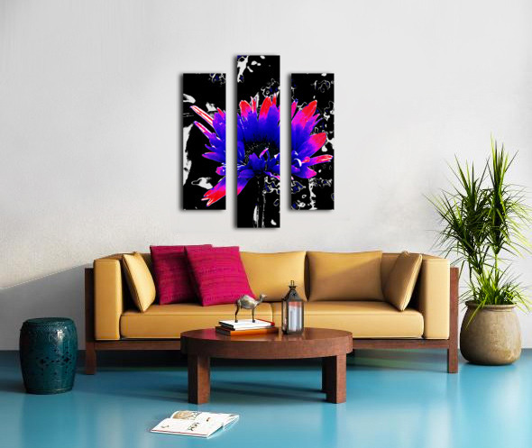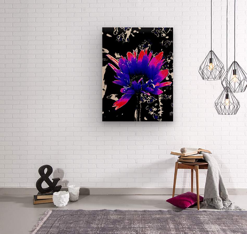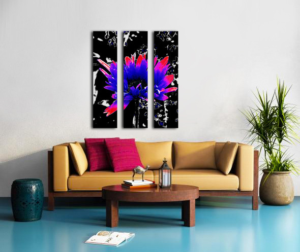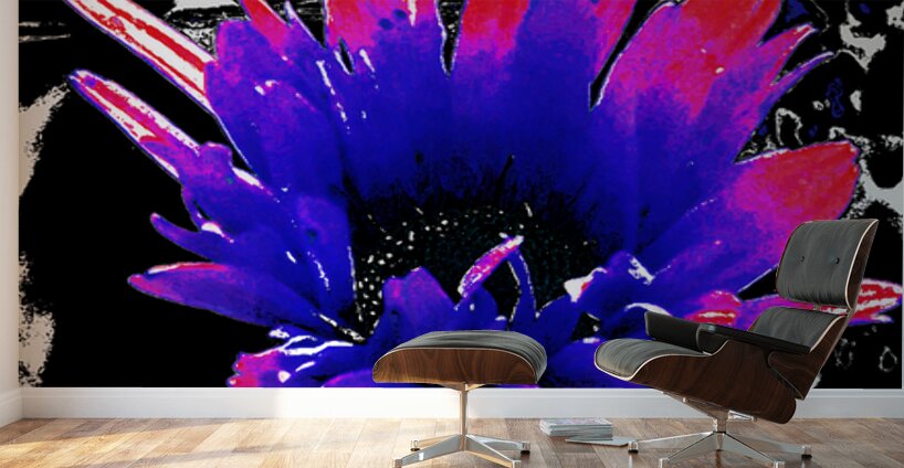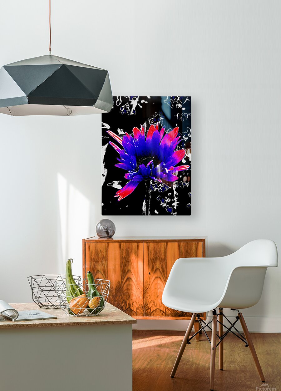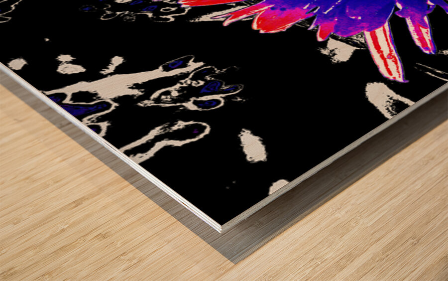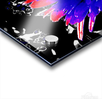 Originally a coloured photo of a Daisy laterally digitally manipulated into a stunning piece of contemporary floral art. Features a vibrant Daisy flower with electric blue and fiery red petals standing out against a dark, abstract background. Its bold colors create a striking contrast, making the flower the focal point of the composition.