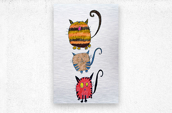 A hand drawn nature inspired design created using ink pens and paper. Features a whimsical trio of stacked cats, each with unique patterns and colours, balance precariously on top of each other. The topmost cat is striped with bright hues, the middle one appears calm with a closed-eye expression, and the lowest cat showcases spiked fur and wide eyes, adding a playful sense of character and imagination.