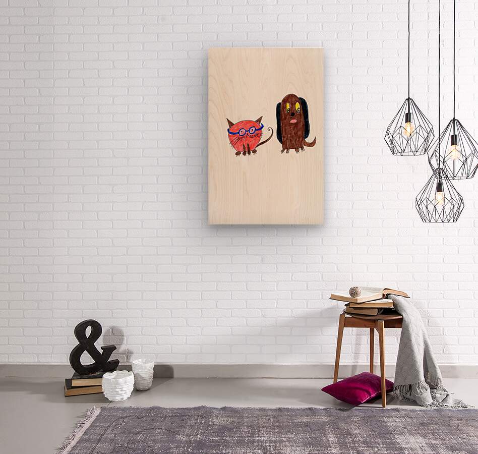 A hand drawn nature inspired design, created using coloured ink pens and paper, laterally digitally manipulated including removing the background in Canva.com. Features a cute cat wearing glasses sitting beside a cute dog with a long face and long ears. The style is simple giving a whimsical feel to the over all composition.