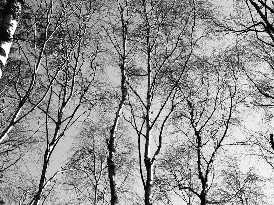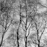 A monochrome photo featuring a network of barren tree branches reaching upward against a clear sky, creating an intricate pattern. The stark contrast between the dark limbs and the bright backdrop highlights the delicate structure of the trees.
