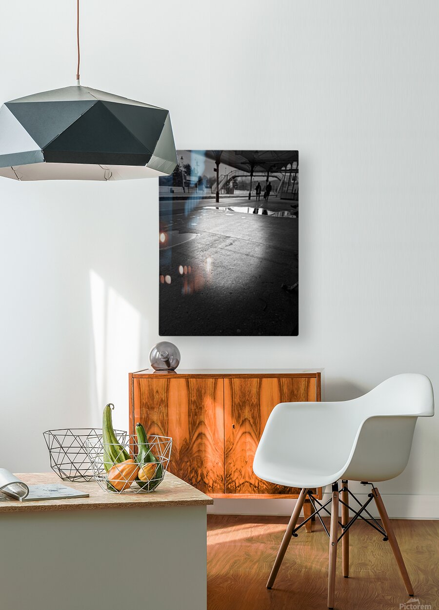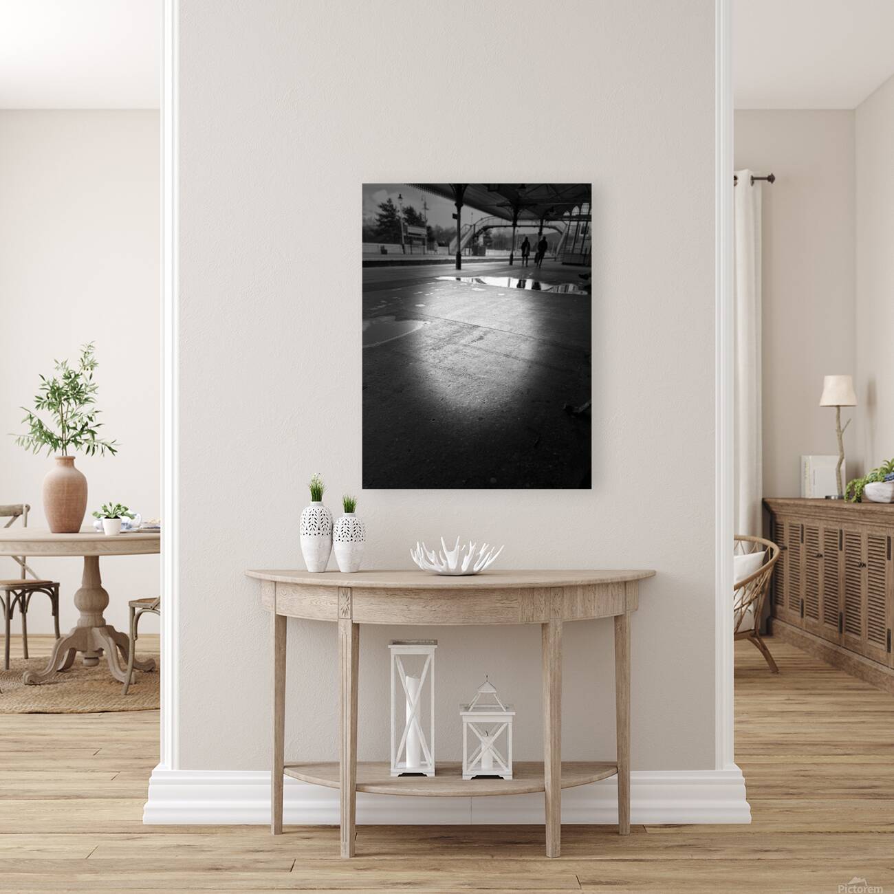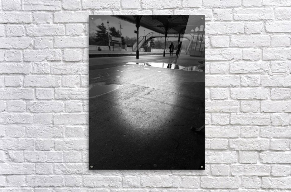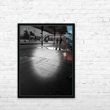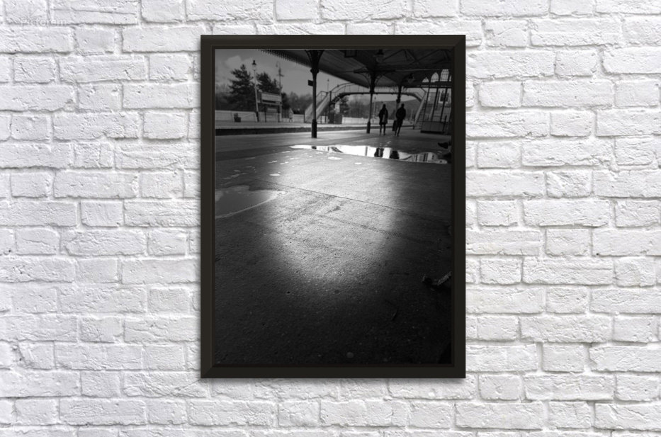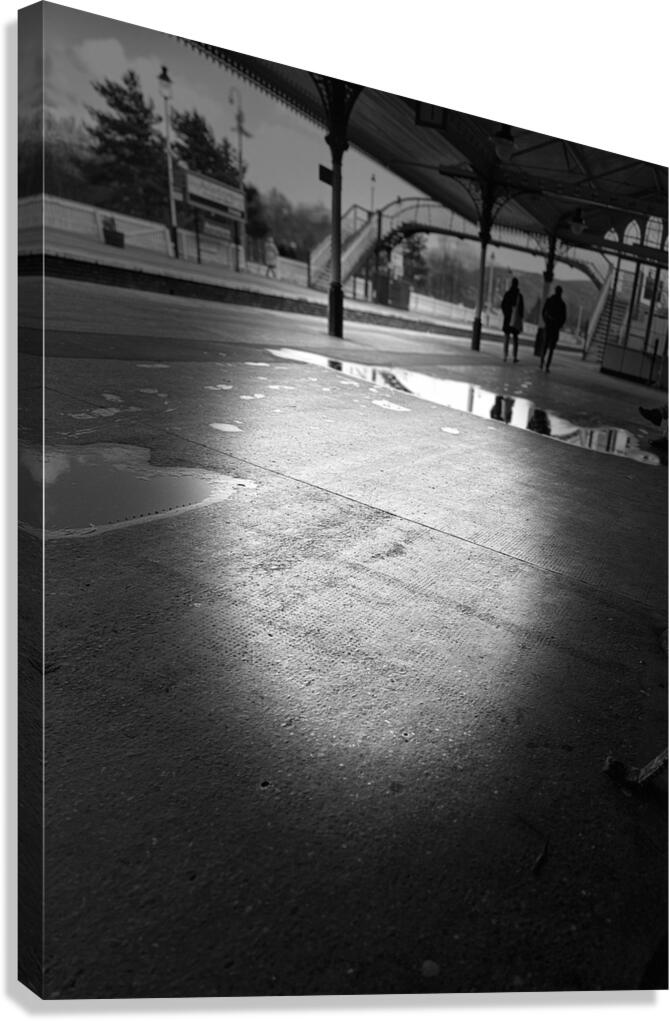 A monochrome photo featuring sunlight reflecting off a wet pavement at a train station, casting shadows under the canopy. Two figures walk in the dist...[+]