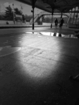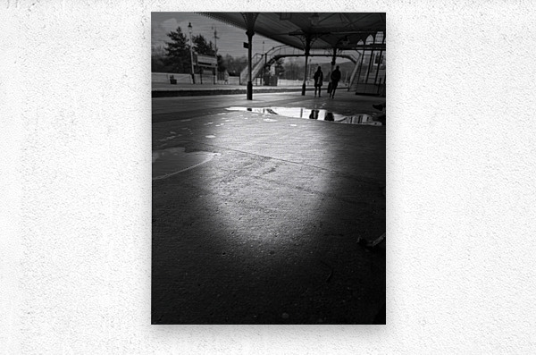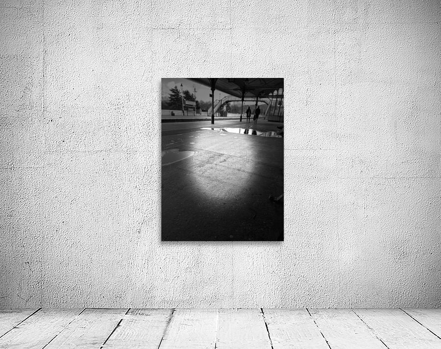 A monochrome photo featuring sunlight reflecting off a wet pavement at a train station, casting shadows under the canopy. Two figures walk in the distance, adding a sense of depth to the scene.