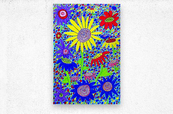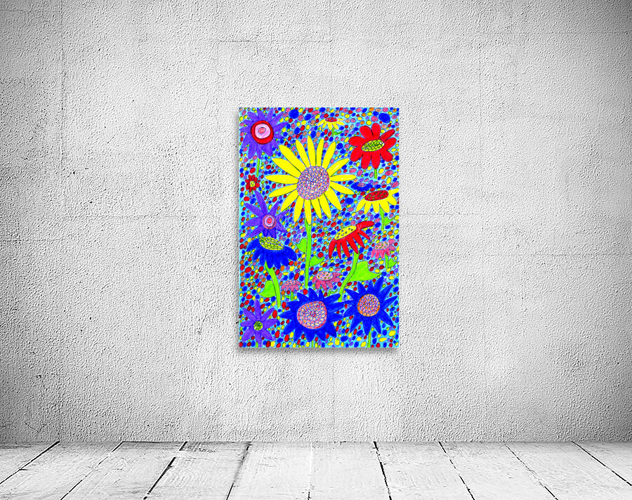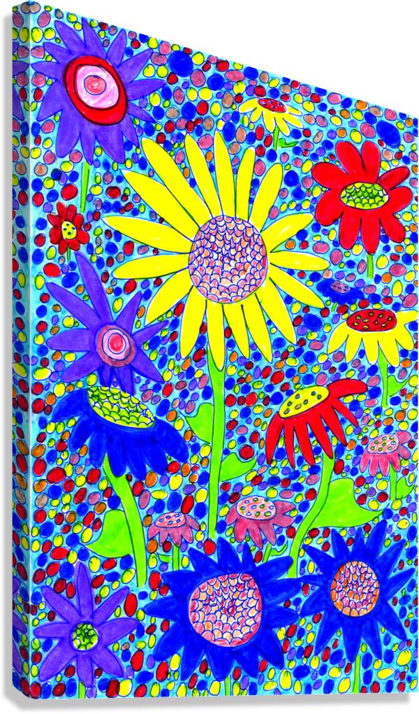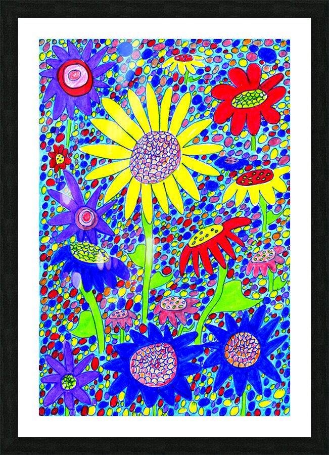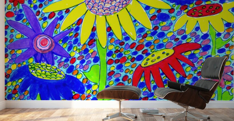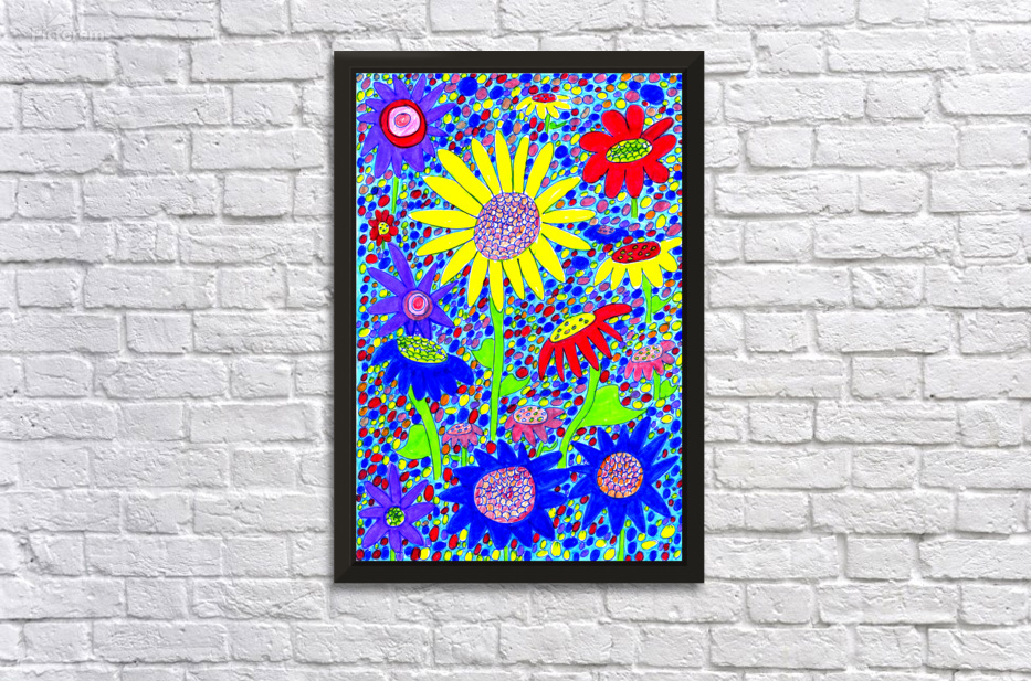 Originally a hand drawn nature inspired design created using coloured ink pens and paper, laterally undergoing some digital colour enhancement to allow a unique floral abstract to emerge. Features brightly colored flowers of various sizes and shapes filling the scene, set against a background teeming with multicolored dots. A playful and vibrant atmosphere is created by the use of bold, vivid colors and whimsical patterns.