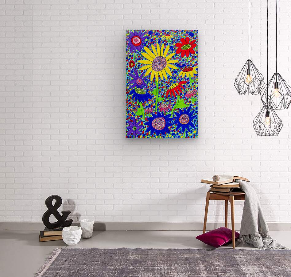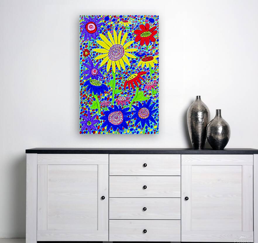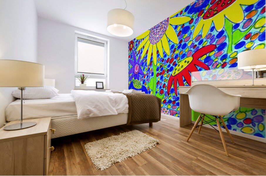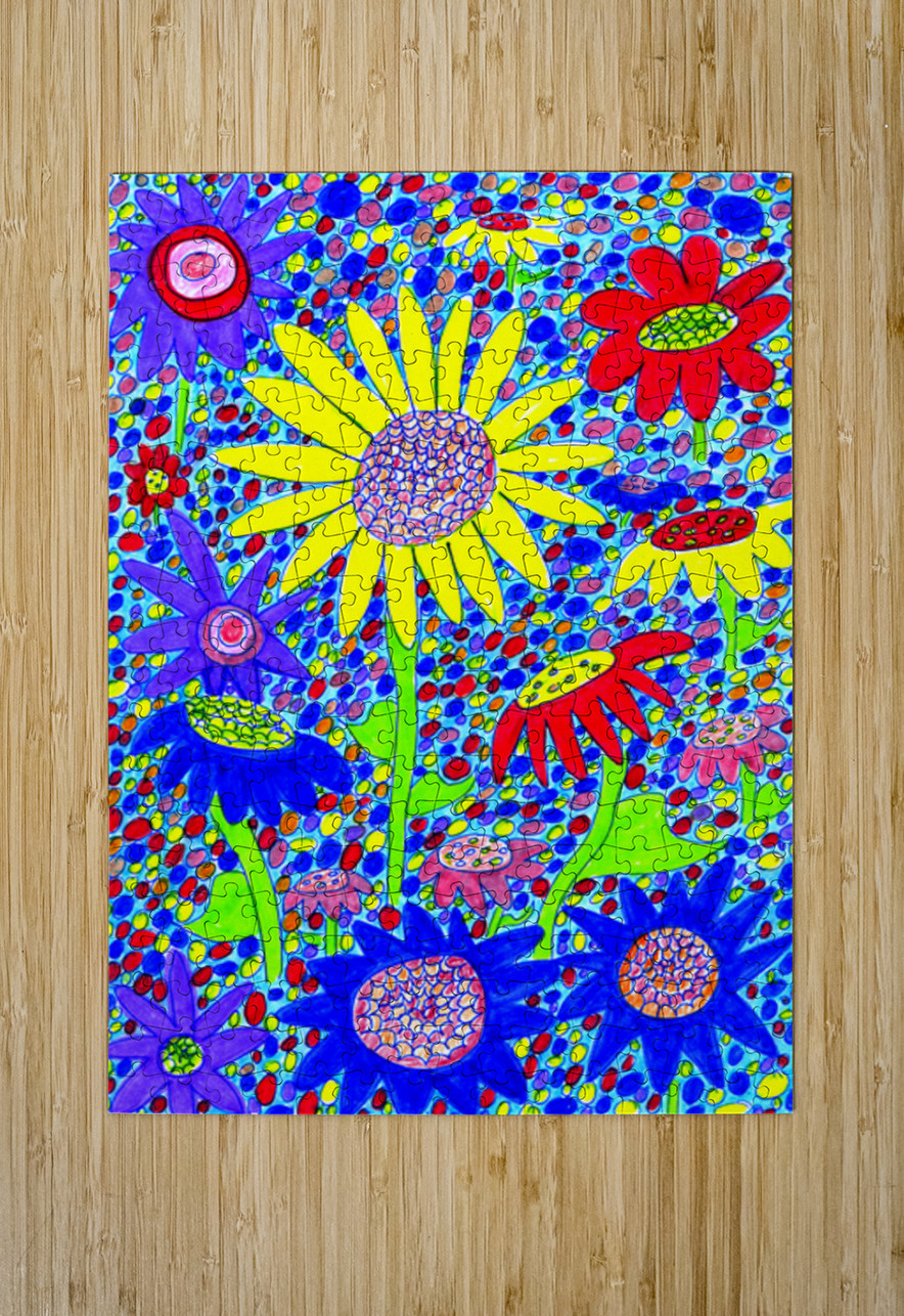 Originally a hand drawn nature inspired design created using coloured ink pens and paper, laterally undergoing some digital colour enhancement to allow a unique floral abstract to emerge. Features brightly colored flowers of various sizes and shapes filling the scene, set against a background teeming with multicolored dots. A playful and vibrant atmosphere is created by the use of bold, vivid colors and whimsical patterns.